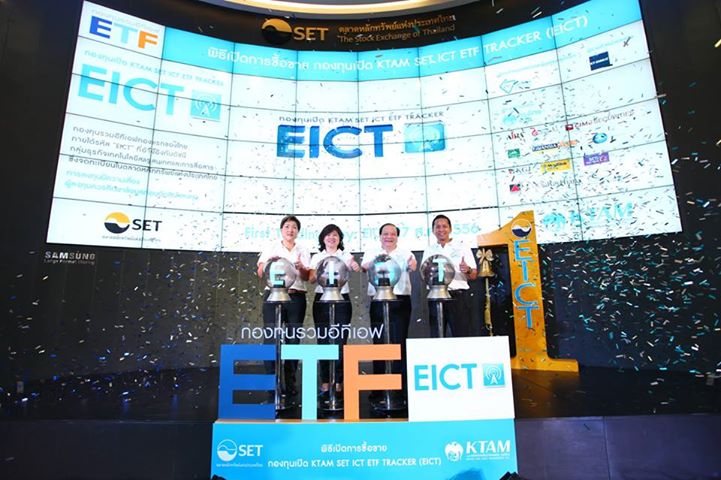 เกศรา มัญชุศรี รองผู้จัดการ ตลาดหลักทรัพย์ฯ นฤมล อาจอำนวยวิภาส กรรมการผู้จัดการ บริษัทหลักทรัพย์ เอเซีย พลัส จำกัด (มหาชน) ชัยภัทร ศรีวิสารวาจา ประธานกรรมการบริหาร บริษัทหลักทรัพย์ เคที ซีมิโก้ จำกัด ร่วมแสดงความยินดีกับ สมชัย บุญนำศิริ กรรมการผู้จัดการ บริษัทหลักทรัพย์จัดการกองทุน กรุงไทย จำกัด (มหาชน) ในโอกาสที่ กองทุนเปิด KTAM SET ICT ETF Tracker “EICT” เข้าซื้อขายในตลาดหลักทรัพย์ฯ เมื่อ 27 สิงหาคม 2556