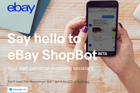เพื่อตอกย้ำความเป็นผู้นำในธุรกิจค้าปลีกออนไลน์ อีเบย์ จึงเปิดตัว “อีเบย์ ช็อปบอท” (eBay ShopBot) เวอร์ชั่นเบต้า ซึ่งเป็นแชทบอทที่ช่วยคัดเลือกสินค้า ขับเคลื่อนด้วยระบบเอไอ (Artificial Intelligence) ที่ผสานกับคลาวด์คอมพิวติ้ง (Cloud Computing) และกระบวนการตัดสินใจของมนุษย์ (Human Judgment) ที่ใช้งานได้ง่ายดายทาง Facebook Messenger โดย “อีเบย์ ช็อปบอท” จะช่วยลูกค้าค้นหาดีลที่ดีที่สุดบนอีเบย์ ผ่านการส่งข้อความพูดคุย ถาม-ตอบ หรือส่งภาพถ่ายสินค้าที่ต้องการ จากนั้น “อีเบย์ ช็อปบอท” อาจถามคำถามเพิ่มเติมอีกเล็กน้อยเพื่อเรียนรู้รสนิยม คุณภาพ ราคา หรือแบรนด์ที่ลูกค้าชื่นชอบ ท้ายที่สุดจึงประมวลผลเป็นรายการแนะนำสินค้าแบบเฉพาะเจาะจงที่ตอบโจทย์ความต้องการของลูกค้าได้อย่างตรงใจมากที่สุด