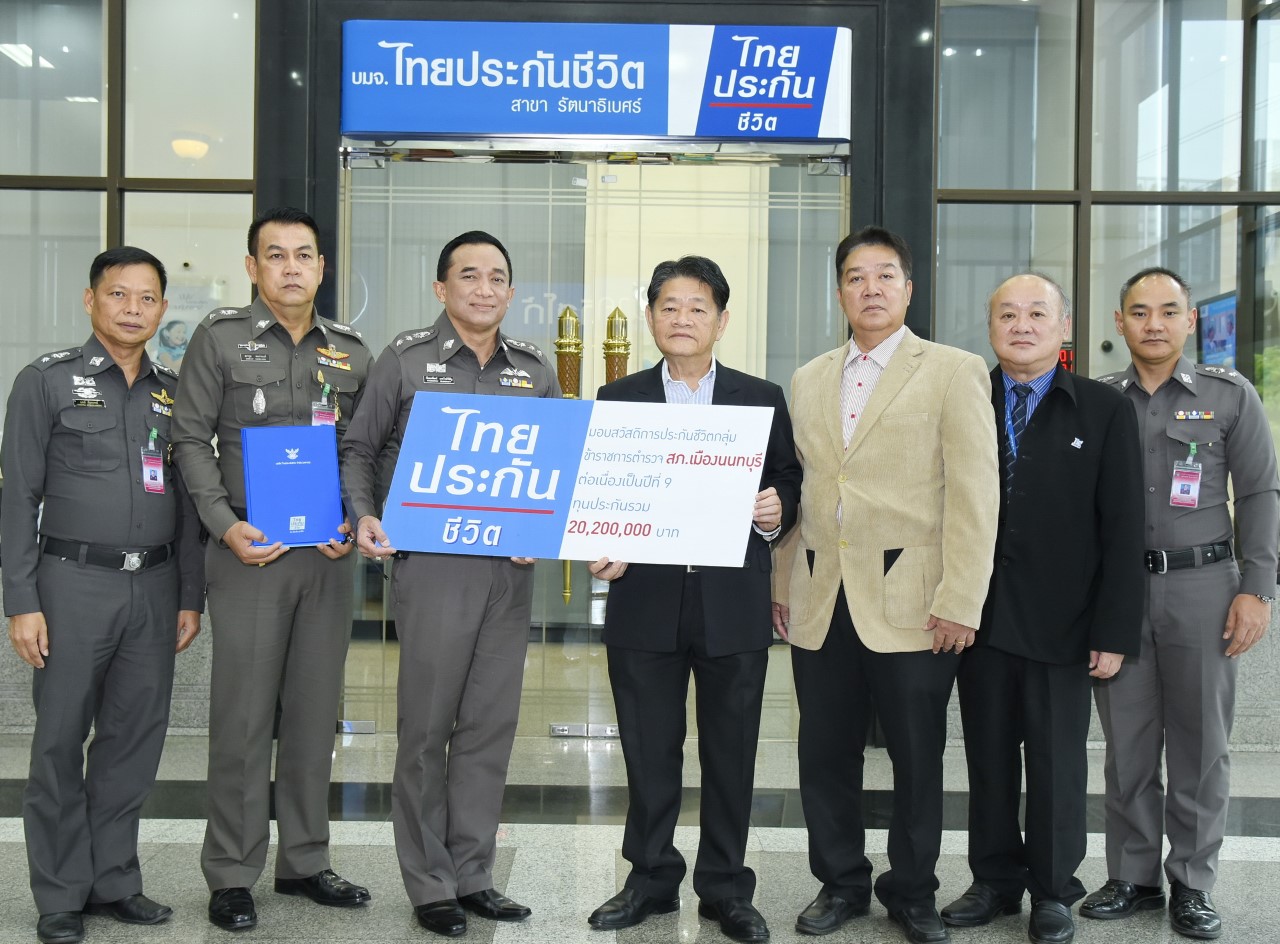 พ.ต.อ.ปัณณพัฒน์ เดชโชติพิสิฐ ผู้กำกับการ สถานีตำรวจภูธรเมืองนนทบุรี รับมอบกรมธรรม์ประกันชีวิตกลุ่มตามโครงการสวัสดิการเพื่อข้าราชการตำรวจ ทุนประกันรวม 20,200,000 บาท จากนายประสิทธิ์ สงยะรัญ ผู้อำนวยการทั่วไป บริษัท ไทยประกันชีวิต จำกัด (มหาชน) โดยบริษัทฯ ให้ความคุ้มครองข้าราชการตำรวจ สถานีตำรวจภูธรเมืองนนทบุรี ต่อเนื่องเป็นปีที่ 9 ณ อาคารไทยประกันชีวิต สาขารัตนาธิเบศร์ จ.นนทบุรี