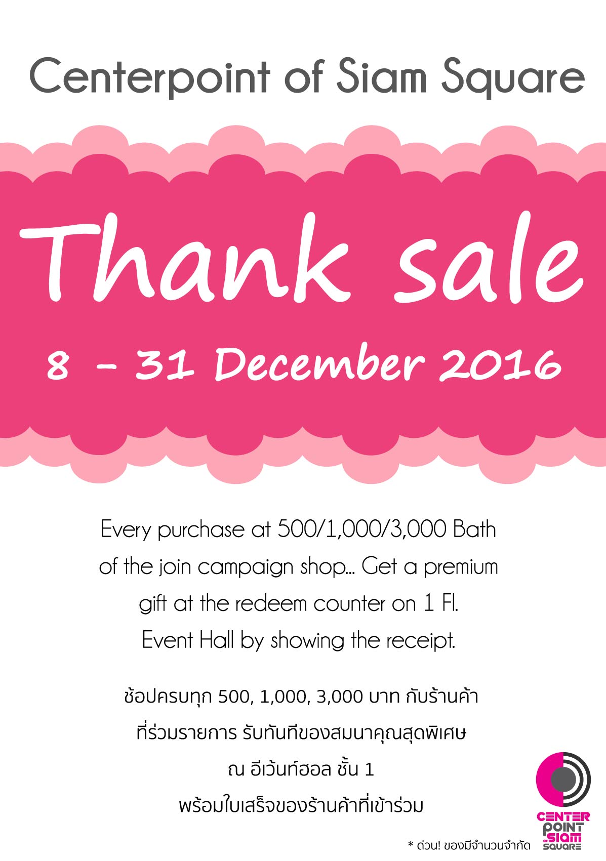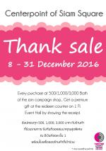 ศูนย์การค้าเซ็นเตอร์พอยท์ ออฟ สยามสแควร์ มอบความสุขส่งท้ายปี กับกิจกรรมสุดพิเศษ “Thank sale 2016” เอาใจขาช้อป เพียงช้อปสินค้าภายในศูนย์การค้าฯ กับร้านค้าที่ร่วมรายการ เช่น Etude, Innisfree, Laneige, Hannese, Beautrium, ต้มตุ๋นชาบู เป็นต้น ครบทุก 500 บาท 1,000 บาท และ 3,000 บาท นำใบเสร็จมาแลกรับของสมนาคุณสุดพิเศษ ฟรี! ไม่เสียค่าใช้จ่ายใด ๆ ทั้งสิ้น ณ บริเวณอีเว้นท์ฮอล ชั้น 1 พร้อมกับใบเสร็จของร้านค้าที่เข้าร่วม ได้ตั้งแต่วันที่ 8 – 31 ธันวาคมนี้ สนใจสอบถามรายละเอียดเพิ่มเติมได้ที่www.facebook.com/centerpointofsiamsquare