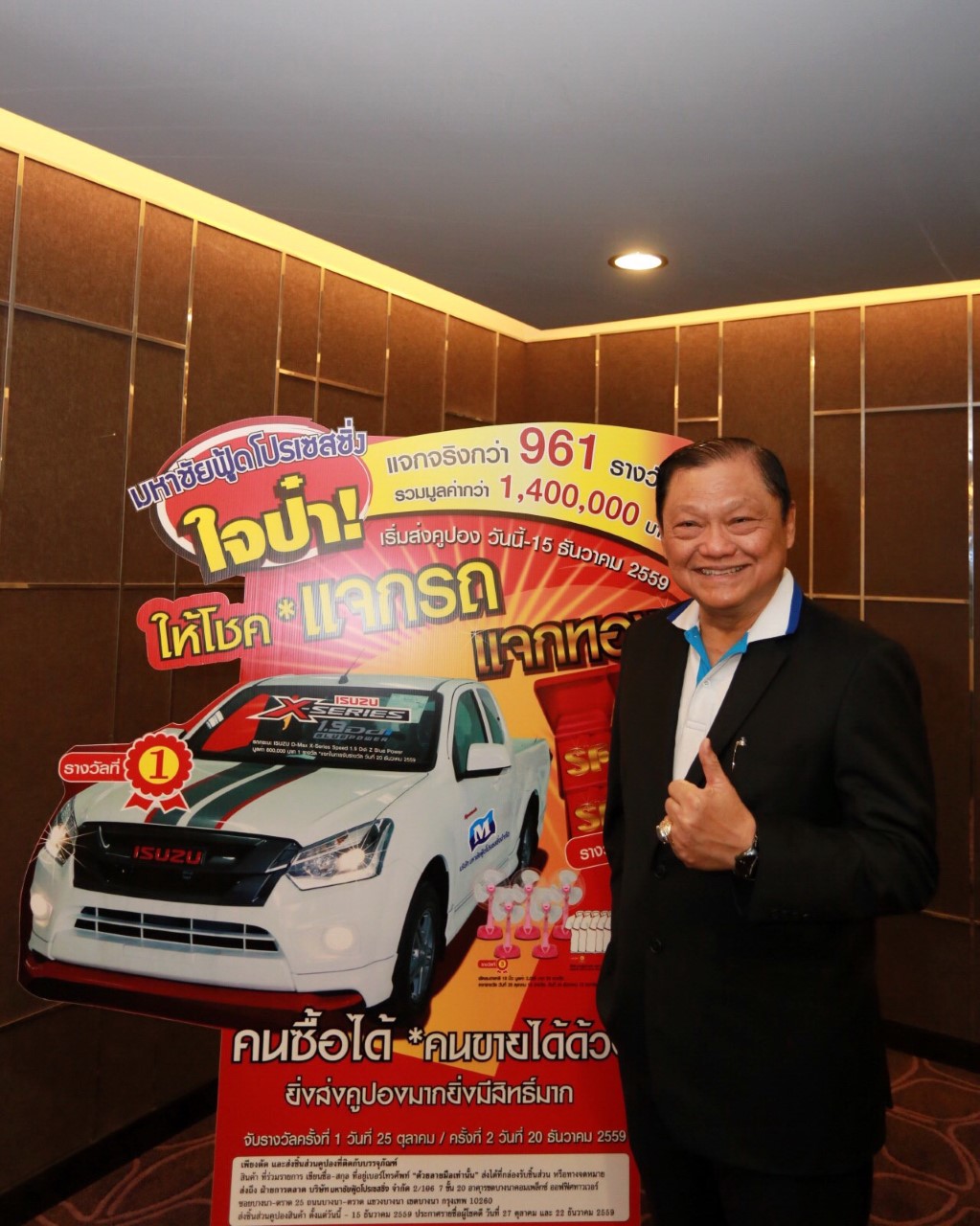 อย่างไรก็ดี เพื่อเป็นการคืนกำไรให้กับลูกค้าและคู่ค้า บริษัท มหาชัยฟู้ดฯ จึงได้จัดกิจกรรมจับฉลากมอบรางวัลให้แก่ลูกค้าและคู่ค้าผู้โชคดีภายใต้แคมเปญ “มหาชัยฟู้ด ใจป๋า แจกรถ แจกทอง” รวมมูลค่ากว่า 1,400,000 บาท ซึ่งเป็นการคืนกำไรให้กับผู้บริโภค โดยคนซื้อได้ คนขายได้ด้วย และได้รับผลตอบรับที่ดีจากลูกค้าทั่วประเทศที่ส่งฉลากเข้ามาร่วมกิจกรรมอย่างมากมาย รวมถึงเป็นการมอบความสุขในเทศกาลปีใหม่นี้ด้วย