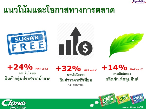 นอกจากนี้ จากกระแสความต้องการของกลุ่มลูกอมระดับพรีเมี่ยมที่มีการขยายตัวมากขึ้นทำให้ มอนเดลีซ เล็งเห็นโอกาสในตลาดกลุ่มพรีเมียมสำหรับลูกอมที่มีราคา 21 บาทขึ้นไป จึงได้มีการพัฒนาสินค้านวัตกรรมใหม่ๆ เข้ามาทำตลาดอย่างต่อเนื่อง และจากการณ์คาดการณ์ว่าภาพรวมตลาดลูกอมพรีเมียมปี 2560 จะมีการขยายตัวมากกว่าปีที่ผ่านมา มอนเดลีซ จึงได้มีการนำเสนอสินค้านวัตกรรมใหม่ที่กำลังได้รับความนิยมในต่างประเทศนำมาใส่ในลูกอมของแบรนด์ คลอเร็ท เพื่อมอบประสบการณ์ที่แตกต่างให้แก่ผู้บริโภคในไทย
