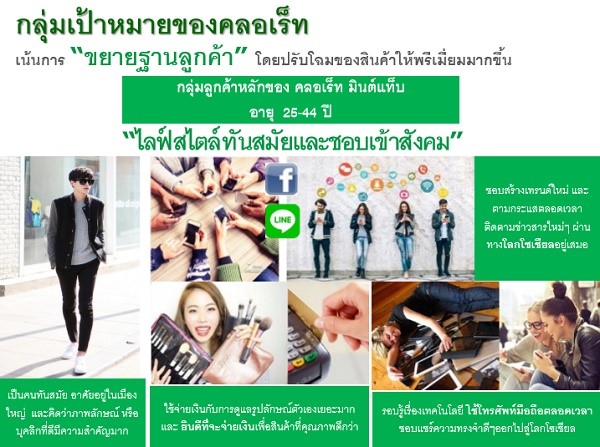 อย่างไรก็ดี เพื่อนำคลอเร็ท มินต์แท็บ สู่กลุ่มผู้บริโภคเป้าหมายในไทย ซึ่งมีไลฟ์สไตล์ที่ชื่นชอบการเข้าสังคม ชอบสร้างเทรนด์ใหม่ๆ และคำนึงถึงคุณภาพอันดับแรก มอนเดลีซ จึงได้มีการส่ง 3 กลยุทธ์หลักเข้ามาพิชิตใจกลุ่มลูกค้าเป้าหมายให้สนใจซื้อ คอลเร็ท มินต์แท็บ บริโภค ประกอบด้วย 1. การเสริมสร้างความพรีเมียมในผลิตภัณฑ์ ด้วยนวัตกรรมเม็ดอมมินต์เข้มข้น ปราศจากน้ำตาล ให้ลมหายใจหอมสดชื่นทันที และยาวนานยิ่งขึ้น ในบรรจุภัณฑ์โลหะสวยงาม ทันสมัย ขนาดกะทัดรัดพกพาสะดวก