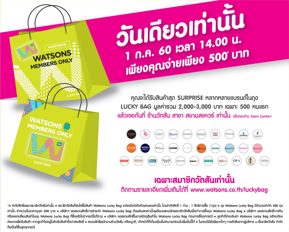 วัตสัน ประเทศไทย ผู้นำร้านเพื่อสุขภาพและความงามอันดับหนึ่งของประเทศไทย จัดกิจกรรม ลัคกี้แบ็ก (Lucky Bag) มอบความสนุกขึ้นไปอีกขั้นให้บรรดาขาช็อป จ่ายเพียง 500 บาท เพื่อสุ่มเลือกถุงช็อปปิ้งที่บรรจุผลิตภัณฑ์เพื่อความงามหลากหลายรายการ มีมูลค่า 2,000 – 3,000 บาท นอกจากความสนุกจุใจแล้ว ยังเปิดประสบการณ์ให้ได้ลองผลิตภัณฑ์ใหม่ๆ อีกด้วย