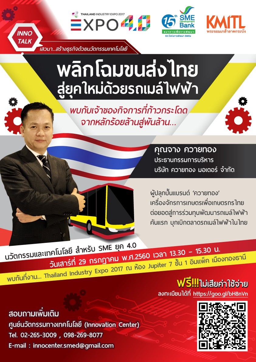ธนาคารพัฒนาวิสาหกิจขนาดกลางและขนาดย่อมแห่งประเทศไทย( ธพว.หรือ SME Development Bank) ร่วมกับ สถาบันเทคโนโลยีพระจอมเกล้าเจ้าคุณทหารลาดกระบัง จัดสัมมนา “พลิกโฉมขนส่งไทยสู่ยุคใหม่ด้วยรถเมล์ไฟฟ้า” วันเสาร์ที่ 29 กรกฏาคม 2560 เวลา 13.30-15.30น. ณ งาน Thailand Industry Expo 2017 ณ ห้อง Jupiter 7 ชั้น 1 อิมแพ็ค เมืองทองธานี