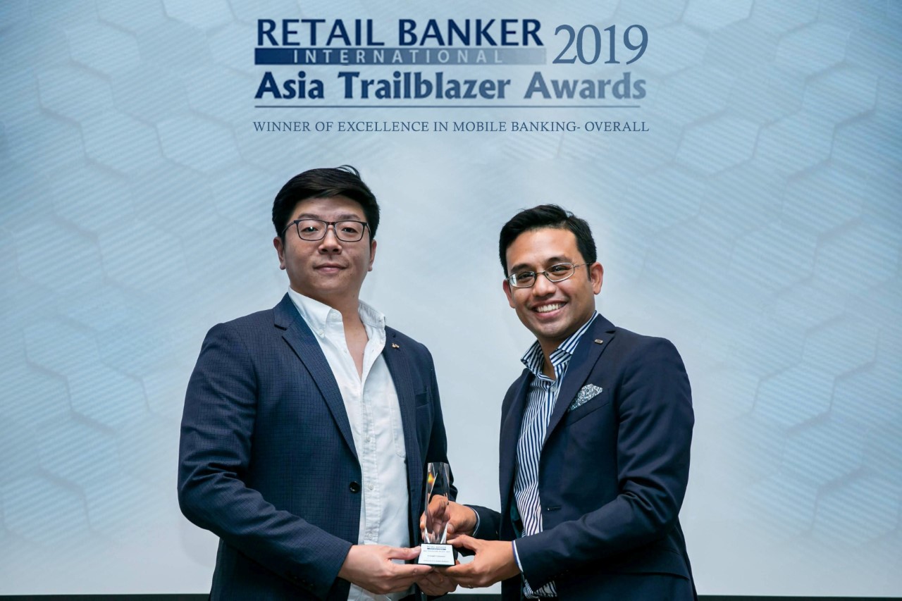 นายแซม ตันสกุล (ขวา) ผู้อำนวยการอาวุโส ฝ่ายนวัตกรรมและฟินเทคและนายปฎิเวธ มหาธีรสมบัติ (ซ้าย) รองผู้อำนวยการ ฝ่ายนวัตกรรมและฟินเทค เป็นตัวแทนกรุงศรี คอนซูมเมอร์ ผู้นำในธุรกิจบัตรเครดิตและสินเชื่อส่วนบุคคล รับรางวัลนวัตกรรมด้านช่องทางการบริการ สาขาโมบาย แบงก์กิ้งยอดเยี่ยม(Channel Innovation Awards - Excellence in Mobile Banking-Overall) จากงาน Retail Banker International Asia Trailblazer Awards 2019