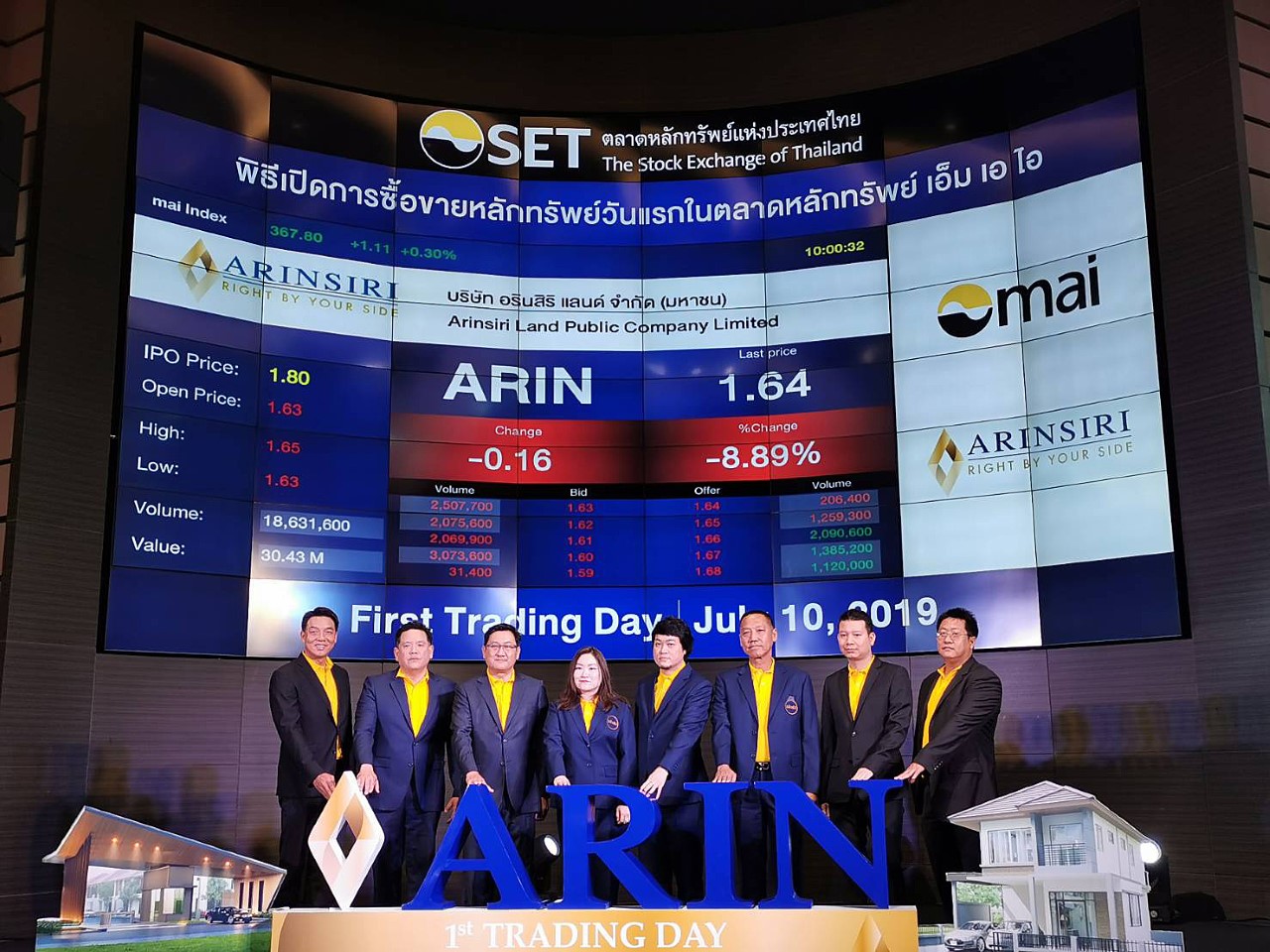 ภากร ปีตธวัชัย กรรมการและผู้จัดการ ตลาดหลักทรัพย์แห่งประเทศไทย ประพันธ์ เจริญประวัติ ผู้จัดการตลาดหลักทรัพย์ เอ็ม เอ ไอ และ พล.ต.อ. วีระพงษ์ ชื่นภักดี ประธานกรรมการ บมจ. อรินสิริ แลนด์ ร่วมพิธีเปิดการซื้อขายวันแรกในตลาดหลักทรัพย์ เอ็ม เอ ไอ ของ บมจ. อรินสิริ แลนด์ ผู้พัฒนาอสังหาริมทรัพย์เพื่อขายในเขตภาคตะวันออก ในวันที่ 10 กรกฎาคม 2562 มูลค่าหลักทรัพย์ ณ ราคา IPO 1,080 ล้านบาท โดยใช้ชื่อย่อในการซื้อขายหลักทรัพย์ว่า “ARIN”