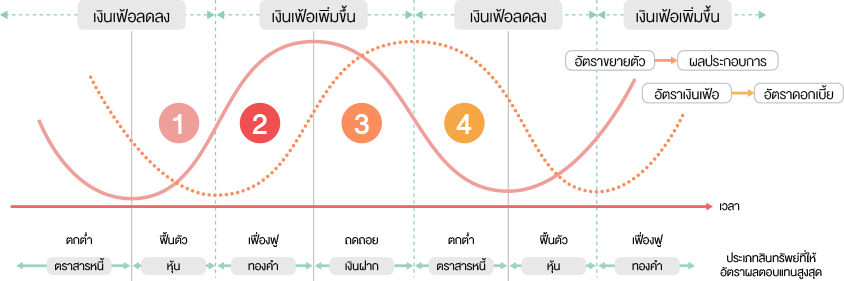 จากภาวะเศรษฐกิจที่แตกต่างกันในแต่ละช่วงเวลา ย่อมทำให้การเลือกลงทุนในสินทรัพย์ประเภทต่างๆ มีความแตกต่างกันไปด้วย โดยภาวะเศรษฐกิจแบ่งออกเป็น 4 ระยะ ได้แก่ ระยะฟื้นตัว (Recovery) ซึ่งเป็นช่วงที่เศรษฐกิจเริ่มฟื้นตัว หลังจากเผชิญภาวะตกต่ำถึงขีดสุด เงินเฟ้อยังอยู่ยังในระดับต่ำ สินค้าที่เหลือค้างสต็อกค่อยๆ ทยอยขายออกราคาสินค้าเริ่มมีแนวโน้มสูงขึ้น ผลประกอบการของธุรกิจดีขึ้น การผลิตเพิ่มขึ้น การจ้างงานสูงขึ้น ประชาชนมีรายได้ดีขึ้น สถาบันการเงินปล่อยสินเชื่อดอกเบี้ยต่ำ เพื่อกระตุ้นให้ผู้ประกอบการลงทุน ทิศทางการลงทุนมีแนวโน้มดีขึ้น