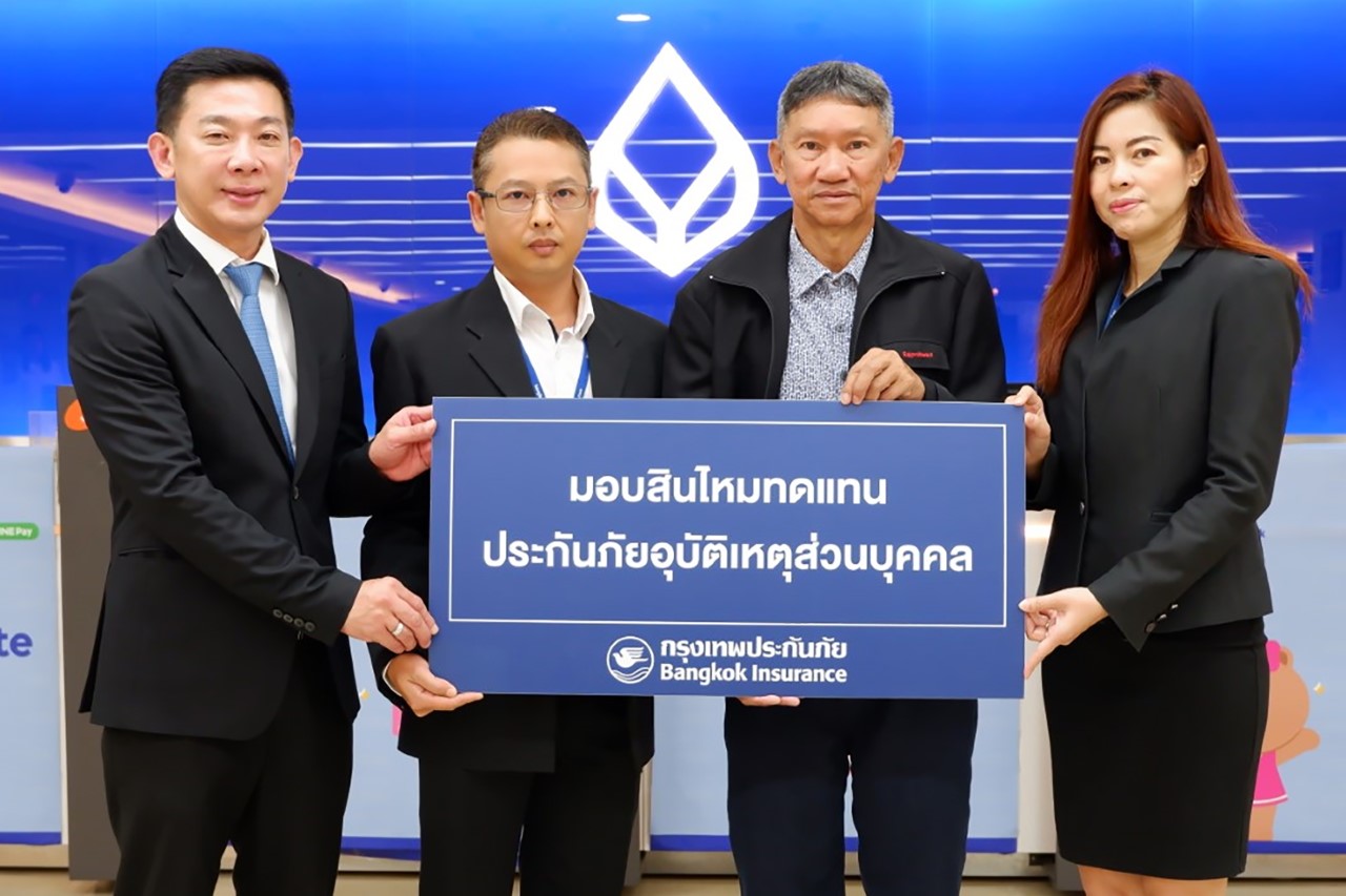 บริษัท กรุงเทพประกันภัย จำกัด (มหาชน) หรือ BKI โดยนายธีรชัย รุ่งเรือง (ที่ 2 จากซ้าย)ผู้จัดการสาขาพัทยา ธุรกิจสาขาและการร่วมทุน เป็นผู้แทนบริษัทฯ มอบสินไหมทดแทนประกันภัยอุบัติเหตุส่วนบุคคล PA 1st VIP จำนวน 1,620,000 บาท ให้แก่นายอนุโรจน์ กฤษปณากุล (ที่ 2 จากขวา) ผู้รับผลประโยชน์ซึ่งเป็นสามีของนางทัศนีย์ กฤษปณากุล ผู้เอาประกันภัยที่ประสบอุบัติเหตุรถจักรยานยนต์เฉี่ยวชนกับรถยนต์เป็นเหตุทำให้เสียชีวิต โดยมีนายนิธิรุจน์ สิริรุจิพัฒน์?(ซ้ายสุด) ผู้จัดการธนาคารกรุงเทพ สาขาศรีราชา ร่วมมอบสินไหมทดแทนและเป็นสักขีพยาน ณ ธนาคารกรุงเทพ สาขาศรีราชา จังหวัดชลบุรี เมื่อวันที่ 28 ตุลาคม 2562
