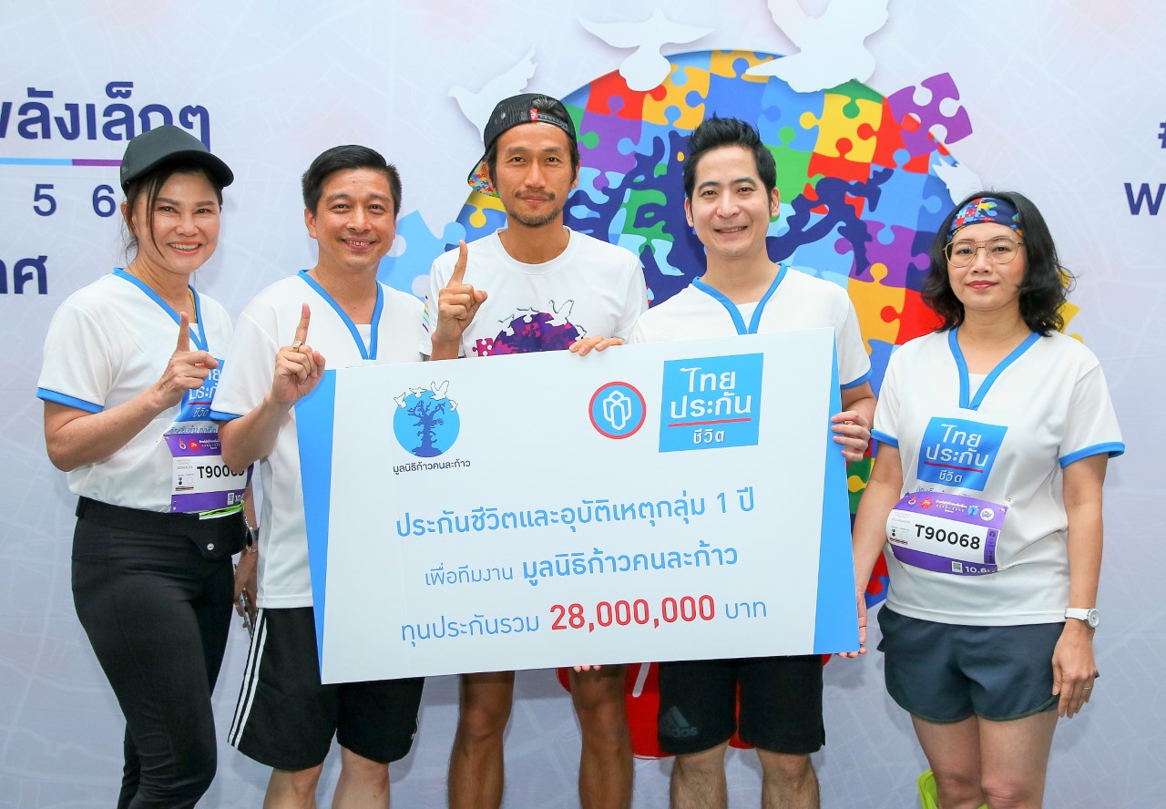นายนิติพงษ์ ปรัชญานิมิต ผู้ช่วยกรรมการผู้จัดการใหญ่ และ Chief Actuary บริษัท ไทยประกันชีวิต จำกัด (มหาชน) มอบกรมธรรม์ประกันชีวิตและอุบัติเหตุกลุ่มแก่นายอาทิวราห์ คงมาลัย ประธานมูลนิธิก้าวคนละก้าว เพื่อให้ความคุ้มครองบุคลากรของมูลนิธิก้าวฯ ทุนประกันรวม 28,000,000 บาท พร้อมนำทีมจิตอาสาร่วมวิ่งระดมทุนในกิจกรรม “ก้าวคนละก้าว”#ก้าวต่อไปด้วยพลังเล็กๆ ภาคใต้ ณ ลากูน่า ภูเก็ต จังหวัดภูเก็ต