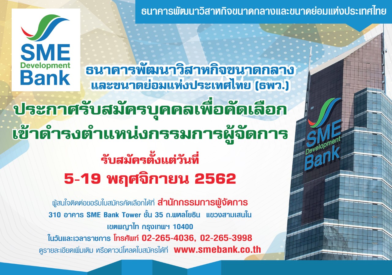 คณะกรรมการสรรหา ธนาคารพัฒนาวิสาหกิจขนาดกลางและขนาดย่อมแห่งประเทศไทย(ธพว.)ได้มีการประชุม โดยมีมติให้ประกาศการรับสมัครบุคคลเพื่อคัดเลือกเข้าดำรงตำแหน่งกรรมการผู้จัดการ ธพว. ตั้งแต่วันที่ 5 – 19 พฤศจิกายน 2562 โดยผู้สมัครต้องมีคุณสมบัติตามพระราชบัญญัติคุณสมบัติมาตรฐานสำหรับกรรมการและพนักงานรัฐวิสาหกิจ พ.ศ.2518 และที่แก้ไขเพิ่มเติมพระราชบัญญัติธนาคารพัฒนาวิสาหกิจขนาดกลางและขนาดย่อมแห่งประเทศไทย พ.ศ.2545 รวมทั้ง พระราชบัญญัติธุรกิจสถาบันการเงิน พ.ศ.2551และที่แก้ไขเพิ่มเติม ตามรายละเอียดที่ระบุในประกาศคณะกรรมการสรรหากรรมการผู้จัดการ ธพว.