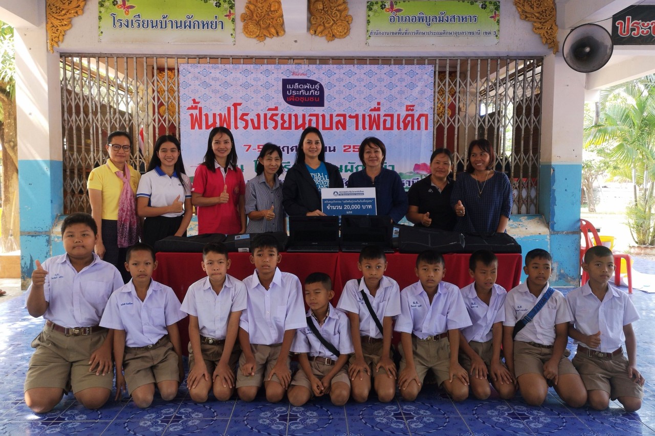 สมาคมประกันวินาศภัยไทย โดยนางสาววัลย์ลิกา บูรณ์ทอง ผู้จัดการอาวุโส ฝ่ายสื่อสารองค์กร ร่วมกิจกรรมพร้อมมอบเงิน จำนวน 20,000 บาท เพื่อจัดซื้อโต๊ะ-เก้าอี้ ที่เสียหายจากน้ำท่วม และเครื่องคอมพิวเตอร์ Notebook เก่าสภาพดีพร้อมใช้งาน จำนวน 10 เครื่อง ให้กับโรงเรียนบ้านผักหย่า และโรงเรียนบ้านไร่ใต้ จังหวัดอุบลราชธานี โดยมี ดร. รัศมี สีหะนันท์ ผู้อำนวยการโรงเรียนบ้านผักหย่า เป็นผู้แทนรับมอบ ในกิจกรรม "เมล็ดพันธุ์ประกันภัยเพื่อชุมชน: ฟื้นฟูโรงเรียนอุบลฯ เพื่อเด็ก ๆ" ณ จังหวัดอุบลราชธานี