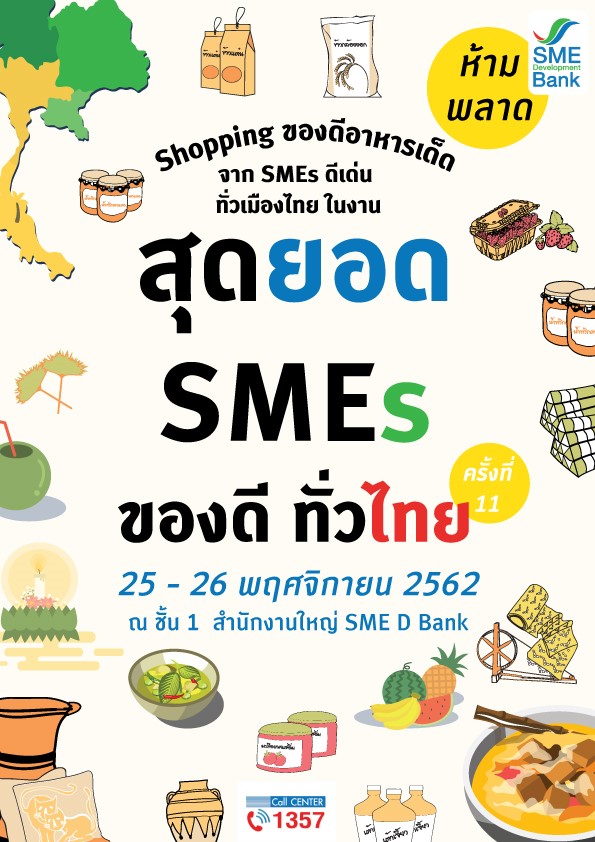 ธนาคารพัฒนาวิสาหกิจขนาดกลางและขนาดย่อมแห่งประเทศไทย (ธพว.) หรือ SME D Bank ร่วมกับ สำนักงานส่งเสริมวิสาหกิจขนาดกลางและขนาดย่อม (สสว.), บริษัท ไปรษณีย์ไทย จำกัด, สำนักงานกรุงเทพมหานคร และ สำนักงานเขตพญาไท นำลูกค้าร่วมออกบูธจำหน่ายสินค้าราคาผู้ผลิต ในงาน “สุดยอด SMEs ของดีทั่วไทย” ครั้งที่ 11 ระหว่างวันที่ 25-26 พฤศจิกายน 2562 เวลา 08.30 – 16.30 น. ณ ลานอเนกประสงค์ ชั้น 1 อาคารสำนักงานใหญ่ SME D Bank ภายในงานรวบรวมสินค้าดีจากสุดยอด SMEs ทั่วประเทศ ส่งตรงจากผู้ผลิตถึงผู้บริโภค อาทิ ปลาทูอบสับปะรด จ.ประจวบคีรีขันธ์, ยาดมสมุนไพร จ.สุพรรณบุรี ได้รับการสนับสนุนจาก สำนักงานกรุงเทพมหานคร นำสินค้าสุดยอดของดี 50 เขตร่วมจำหน่าย บริษัท ไปรษณีย์ไทย จำกัด จำหน่ายส้มโอ ปลอดสาร ในราคาชาวสวน เป็นต้น เพื่อสร้างโอกาส ขยายช่องทางการตลาดสามารถเข้าถึงทุกกลุ่มเป้าหมาย ช่วยลดภาระค่าใช้จ่ายภาคประชาชน กระตุ้นการจับจ่ายใช้สอยเพื่อขับเคลื่อนเศรษฐกิจให้คึกคัก สอบถามข้อมูลเพิ่มเติม Call Center 1357