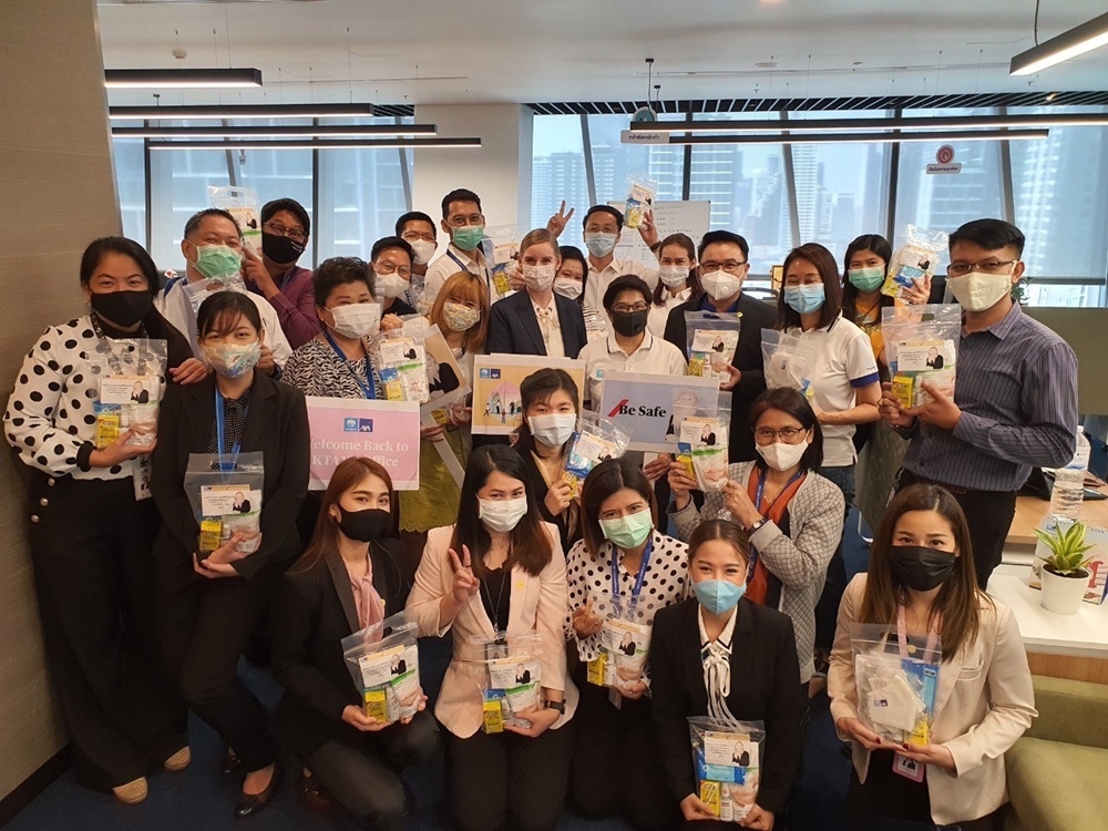 บมจ.กรุงไทย-แอกซ่า ประกันชีวิต นำโดย นางแซลลี่ โอฮาร่า ประธานเจ้าหน้าที่บริหาร (คนกลาง) พร้อมผู้บริหาร มอบชุดของ Care welcome gift set แก่พนักงานที่เริ่มกลับเข้ามาปฏิบัติงานที่สำนักงานใหญ่ และสาขา โดยชุด Care welcome gift set ประกอบด้วย หน้ากากอนามัย สเปรย์แอลกอฮอล์ ทิชชู่เปียกผสมแอลกอฮอล์ สบู่ล้างมือ และเครื่องดื่มวิตามินซี พร้อมกันนี้บริษัทฯ มีนโยบาย และข้อกำหนดในการปฎิบัติตัวแก่พนักงาน ขณะที่ทำงานในบริษัทฯ รวมถึงผู้ที่เข้ามาติดต่อ ซึ่งเป็นไปตามข้อกำหนดด้านสุขภาพ และความปลอดภัยอย่างสูงสุด อีกทั้งการดูแลความสะอาดภายในบริษัทฯ ซึ่งแสดงถึงความห่วยใยสุขภาพของพนักงานทุกคนในช่วงสถานการณ์ไวรัสโคโรนา 2019 (COVID-19) และมุ่งหวังให้ทุกคนมีสุขภาพแข็งแรง พร้อมส่งกำลังใจให้กับทุกคนผ่านพ้นวิกฤตในครั้งนี้ไปด้วยกัน