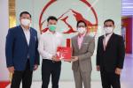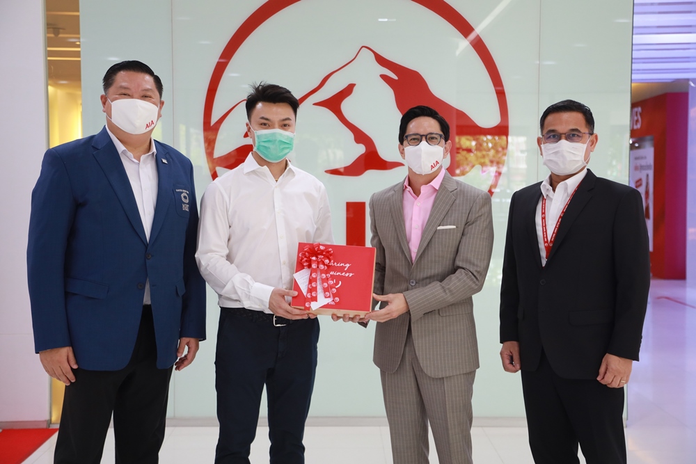 นายกฤษณ์ จันทโนทก (ที่สองจากขวา) ประธานเจ้าหน้าที่ฝ่ายตัวแทนประกันชีวิต เอไอเอ ประเทศไทย เป็นตัวแทนมอบของที่ระลึกเพื่อเป็นการขอบคุณให้แก่ นายฉลองชัย มาเสถียรวงศ์ (ที่สองจากซ้าย) ซึ่งเป็นลูกค้ารายแรกของเอไอเอ ประเทศไทย ที่ซื้อกรมธรรม์ประกันชีวิต ‘เอไอเอ ซีไอ ซุปเปอร์แคร์ (AIA CI SuperCare)’ ผลิตภัณฑ์ประกันโรคร้ายแรง ผ่านการนำเสนอขายรูปแบบใหม่ ‘Digital Face to Face’ ถือเป็นความสำเร็จของเอไอเอ ประเทศไทย รวมไปถึงตัวแทนประกันชีวิตเอไอเอ ที่ได้ดูแลและมอบความคุ้มครองให้แก่ลูกค้า แม้อยู่ในช่วงสถานการณ์การแพร่ระบาดของโรคโควิด-19 ที่ต้องมีการเว้นระยะห่างทางสังคม (Social Distancing)
