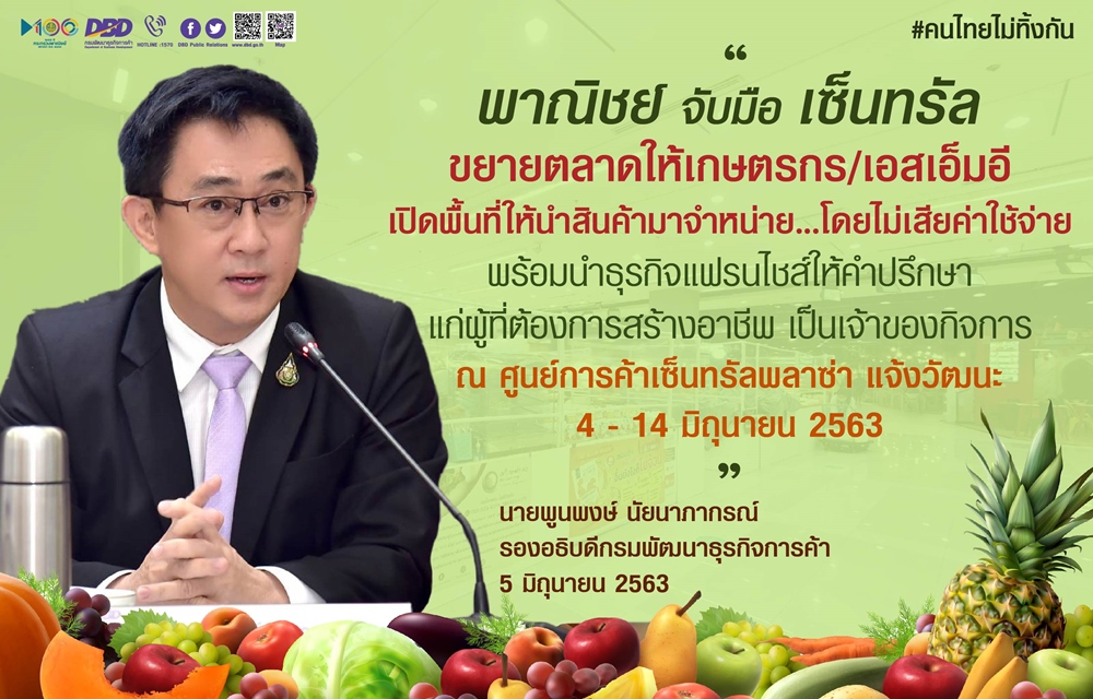 “ล่าสุด กระทรวงพาณิชย์ โดยกรมพัฒนาธุรกิจการค้า ร่วมกับ บริษัท? เซ็นทรัลพัฒนา? จำกัด? (มหาชน)? จัดกิจกรรมสร้างโอกาส-ขยายตลาดให้แก่เกษตรกร และผู้ประกอบการเอสเอ็มอี ที่ได้รับผลกระทบจากการแพร่ระบาดของโรคโควิด-19 เปิดพื้นที่ให้นำสินค้ามาจำหน่ายโดยไม่เสียค่าใช้จ่ายใดๆ ทั้งสิ้น ณ บริเวณลานโปรโมชั่น ซึ่งเป็นพื้นที่ทำเลทองภายในศูนย์การค้าเซ็นทรัลพลาซ่า เพียงขอความร่วมมือผู้จำหน่ายสินค้าให้นำสินค้าที่มีคุณภาพดี ราคาพิเศษมาจำหน่ายเท่านั้น เพื่อช่วยลดค่าครองชีพให้ประชาชน/ผู้บริโภคอีกทางหนึ่ง ทำให้ทั้งเกษตรกร ผู้ประกอบการเอสเอ็มอี และประชาชน ต่างได้รับประโยชน์กันทุกฝ่าย ขณะเดียวกัน ยังเป็นการประชาสัมพันธ์สินค้าให้เป็นที่รู้จัก สร้างโอกาสทางการตลาดให้แก่ผู้ประกอบการในการขยายตลาดให้ครอบคลุมกลุ่มเป้าหมายมากขึ้น”