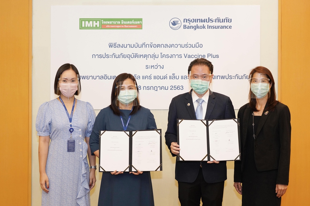 บริษัท กรุงเทพประกันภัย จำกัด (มหาชน) หรือ BKI โดย นางสาวปวีณา จูชวน (ที่ 2 จากซ้าย) ผู้ช่วยกรรมการผู้อำนวยการใหญ่ และ นางสาวลสา โสภณพนิช (ซ้ายสุด) ผู้อำนวยการ ธุรกิจนายหน้า และบริษัท โรงพยาบาลอินเตอร์เมดิคัล แคร์ แอนด์ แล็บ จำกัด (มหาชน) หรือ IMH โดย ดร.สิทธิวัตน์ กำกัดวงษ์ (ที่ 2 จากขวา) ประธานเจ้าหน้าที่บริหาร และ นางสาวปรมาภรณ์ ปวโรจน์กิจ (ขวาสุด) รองประธานเจ้าหน้าที่บริหาร ร่วมลงนามบันทึกข้อตกลงความร่วมมือในโครงการ Vaccine Plus ซึ่งจะมอบ ประกันอุบัติเหตุและสิทธิประโยชน์ให้แก่ลูกค้าในโครงการดังกล่าว ณ อาคารกรุงเทพประกันภัย สำนักงานใหญ่ ถนนสาทรใต้ เมื่อวันที่ 8 กรกฎาคม 2563
