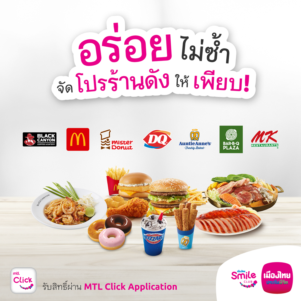ล่าสุด เมืองไทยสไมล์คลับ ขอเชิญชวนสมาชิกฯ ใช้คะแนนสะสม Smile Point แลกรับสิทธิพิเศษ “อร่อยไม่ซ้ำ จัดโปรร้านดังให้เพียบ” ณ ร้านค้าและร้านอาหารที่ร่วมรายการดังนี้ MC DONALD’S สมาชิกฯ ใช้คะแนนสะสม Smile Point 15 คะแนน แลกรับส่วนลดแทนเงินสด 60 บาท ที่ร้านแมคโดนัลด์ทุกสาขา ยกเว้น สาขาสนามบิน เอ็มควอเทียร์ บริการจัดส่งถึงบ้าน 1711 และออนไลน์ (1 ท่าน / 4 สิทธิ์ / วัน จำนวนทั้งหมด 1,500 สิทธิ์) หรือใช้คะแนนสะสม Smile Point 38 คะแนน แลกรับส่วนลดแทนเงินสด 150 บาท (1 ท่าน / 4 สิทธิ์ / วัน จำนวนทั้งหมด 2,000 สิทธิ์) สมาชิกฯ สามารถแลกคะแนนสะสม Smile Point ได้ตั้งแต่วันนี้ – 31 สิงหาคม 2563