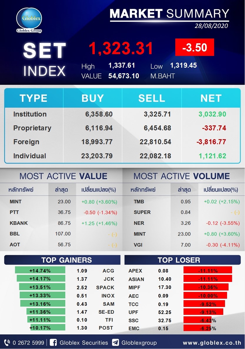 นอกจากนี้ ดัชนียังถูกหนุนด้วยกลุ่มโรงไฟฟ้า และหุ้นรายตัว อาทิ VGI ที่มีข่าว Kerry Express เตรียมยื่น Filing เข้าตลาด ขณะที่วันศุกร์ดัชนี SET Index ปิดลดลงเล็กน้อยที่ 1,323.31 จุด (-3.50 จุด) Volume 5.4 หมื่นล้านบาท