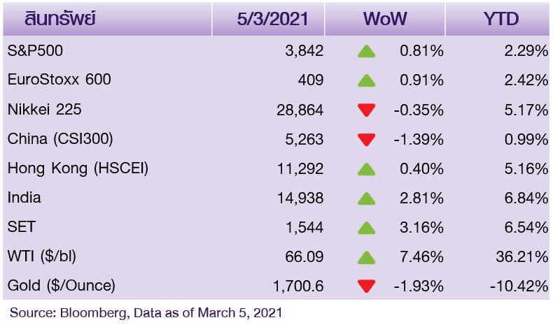 ในสัปดาห์ที่ผ่านมา (1-5 มี.ค.) ตลาดหุ้นสหรัฐฯ ปิดบวก โดยได้แรงหนุนจากข่าวที่สำนักงานคณะกรรมการอาหารและยา (FDA) ของสหรัฐฯ อนุมัติวัคซีนโควิด-19 ของจอห์นสันแอนด์จอห์นสัน และตัวเลขการจ้างงานนอกภาคเกษตรของสหรัฐฯ เดือน ก.พ.ที่เพิ่มขึ้นสู่ระดับ 3.79 แสนตำแหน่ง ซึ่งดีกว่าคาดที่ 2.1 แสนตำแหน่ง อย่างไรก็ตาม ดัชนีฯปรับเพิ่มขึ้นค่อนข้างจำกัด เนื่องจากยังได้รับปัจจัยกดดันจากอัตราผลตอบแทนพันธบัตรสหรัฐฯ อายุ 10 ปีที่เพิ่มขึ้นอยู่ที่ 1.57% ในขณะที่ ตลาดหุ้นยุโรป ปิดบวก หลังดัชนีผู้จัดการฝ่ายจัดซื้อภาคการผลิตของยูโรโซน เดือนม.ค.เพิ่มขึ้นจากเดือนก่อนหน้า และมากกว่าที่คาด ประกอบกับมีแรงซื้อในหุ้นกลุ่มวัฏจักร และกลุ่มสันทนาการ ซึ่งมีแนวโน้มได้อานิสงส์จากการเปิดเศรษฐกิจ ส่วนตลาดหุ้นจีน (A-Share) ปรับลดลง หลังมีรายงานว่า ทางการจีนกำลังพิจารณาแผนการควบคุมกระแสเงินทุนไหลเข้า และป้องกันความผันผวนของตลาด ในขณะที่ ตลาดหุ้นไทย ปิดบวก หลังมีรายงานว่า รัฐบาลไทยกำลังเร่งจัดเตรียมแผนในการออก Vaccine Passport และแรงซื้อนำหุ้นกลุ่มธนาคาร และกลุ่มน้ำมัน ตามอัตราผลตอบแทนพันธบัตรไทย และราคาน้ำมันดิบที่ปรับเพิ่มขึ้น ตามลำดับ สำหรับราคาน้ำมันดิบที่ปรับเพิ่มขึ้นแรงอยู่ในระดับสูงสุดในรอบ 28 เดือน ได้แรงหนุนจากการที่ประชุมกลุ่มโอเปกพลัสขยายเวลาลดกำลังการผลิต 7.7 ล้านบาร์เรลต่อวัน ออกไปอีก 1 เดือน และการที่ซาอุดิอาระเบียปรับลดกำลังการผลิตโดยสมัครใจ 1 ล้านบาร์เรลต่อวัน ออกไปอีก 1 เดือน ส่วนราคาทองคำ ปิดลบ โดยได้รับแรงกดดันจากอัตราผลตอบแทนพันธบัตรสหรัฐฯ อายุ 10 ปีที่เพิ่มขึ้นอยู่ระดับสูงสุดในรอบ 1 ปี และเงินดอลลาร์ สหรัฐฯที่แข็งค่าขึ้นเทียบเงินสกุลหลัก