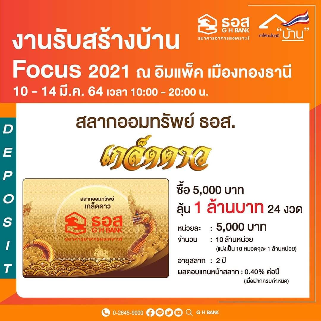 ธนาคารอาคารสงเคราะห์ (ธอส.) ขนผลิตภัณฑ์ทางการเงินให้บริการลูกค้าประชาชนที่ “งานรับสร้างบ้าน Focus 2021” พบกับสินเชื่อบ้านอัตราดอกเบี้ยพิเศษปีแรก 2.60% ต่อปี ดอกเบี้ยเฉลี่ย 3 ปีแรกเพียง 2.917% กรณีกู้ 1 ล้านบาท ผ่อนชำระเริ่มต้นแค่ 3,400 บาท/เดือนเท่านั้น พิเศษ!! ฟรีค่าธรรมเนียมการยื่นกู้ ทางด้านเงินฝากพบกับสลากออมทรัพย์ ธอส. ชุดเกล็ดดาว หน่วยละ 5,000 บาท อายุสลาก 2 ปี ได้ลุ้นรางวัลสูงสุด 1 ล้านบาททุกเดือน และเงินฝากออมทรัพย์ New Flexi for Welfare and Corporate อัตราดอกเบี้ยพิเศษสูงสุด 1.10% ต่อปี จองสิทธิ์ผลิตภัณฑ์ของธนาคารได้ในงานระหว่างวันที่ 10-14 มีนาคม 2564 ณ อิมแพ็ค เมืองทองธานี
