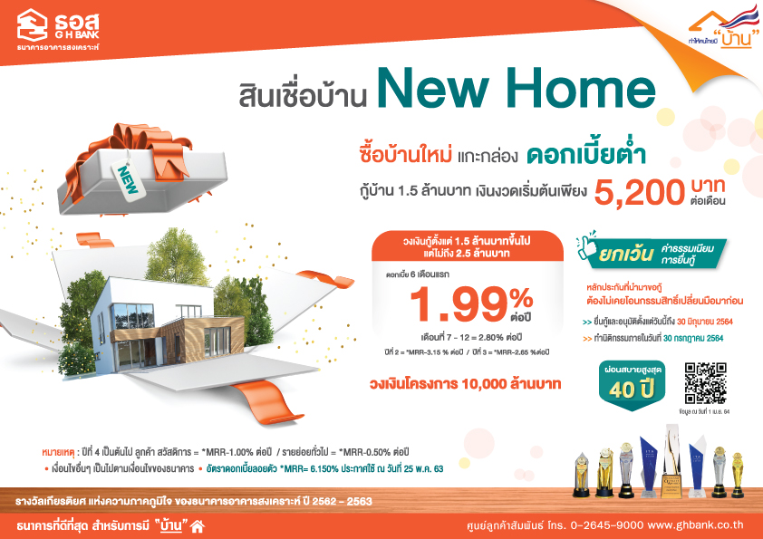 ทั้งนี้ สินเชื่อบ้าน New Home เป็นหนึ่งในผลิตภัณฑ์สินเชื่อกลุ่ม Business Solution สำหรับลูกค้าที่มีรายได้ระดับปานกลาง ซึ่งปัจจุบัน ธอส. มีสัดส่วนสินเชื่อในระดับวงเงิน 1.5-2.5 ล้านบาท มากที่สุด โดยคิดเป็น 42% ของวงเงินนิติกรรมของธนาคาร และด้วยอัตราดอกเบี้ยที่อยู่ในระดับต่ำ จึงเชื่อว่าสินเชื่อบ้าน New Home จะเป็นผลิตภัณฑ์ที่สามารถตอบโจทย์ความต้องการของประชาชนที่ต้องการมีบ้านในปัจจุบันได้เป็นอย่างดี สอบถามรายละเอียดเพิ่มเติมได้ที่ ธอส. ทุกสาขาทั่วประเทศ หรือ ศูนย์ลูกค้าสัมพันธ์ (Call Center) โทร 0-2645-9000 และ Facebook Fanpage ธนาคารอาคารสงเคราะห์ และ ติดตามข้อมูลข่าวสารได้ที่ Application : GHB ALL และ www.ghbank.co.th