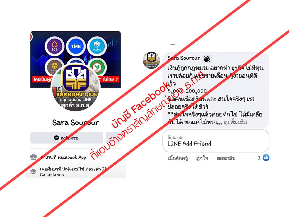 ธ.ก.ส. เตือน ! เกษตรกรลูกค้าและประชาชนทั่วไป ระวังการแอบอ้างโดยใช้ตราสัญลักษณ์ของธนาคารทำการปล่อยเงินกู้ผ่านทาง Facebook ย้ำ ! ธ.ก.ส. ไม่มีส่วนเกี่ยวข้องกับบัญชีดังกล่าวและไม่มีนโยบายปล่อยเงินกู้ผ่าน Facebook แต่อย่างใด โดยมี Facebook Page ที่เป็นทางการของธนาคารคือ “ธกส BAAC Thailand” และ “ธกส บริการด้วยใจ” มุ่งเน้นการสื่อสารผลิตภัณฑ์ บริการและกิจกรรมต่าง ๆ กับลูกค้าเท่านั้น หากพบเห็นการแอบอ้างต่าง ๆ สามารถแจ้ง ได้ที่ Call Center 02 555 0555