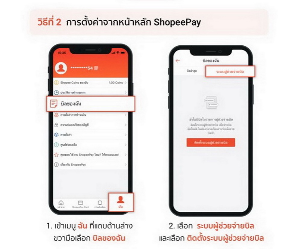 ?หรือเปิดใช้งานจากการตั้งค่าที่หน้าหลักของ ShopeePay โดยเข้าเมนู ฉัน ที่แถบด้านล่างขวามือ แล้วกดเลือก บิลของฉัน จากนั้นเลือก ระบบผู้ช่วยจ่ายบิล และเลือก ติดตั้งระบบผู้ช่วยจ่ายบิล เพียงเท่านี้ก็สามาถตัดยอดบิลอัตโนมัติได้ง่ายๆ ในทุกเดือน