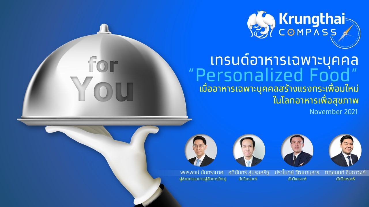 ดร.พชรพจน์ นันทรามาศ ผู้ช่วยกรรมการผู้จัดการใหญ่ ศูนย์วิจัย Krungthai COMPASS ธนาคารกรุงไทย เปิดเผยว่า ปัจจุบันผู้บริโภคยุคใหม่หันมาใส่ใจสุขภาพมากขึ้น อีกทั้งการผนวกกันของ 2 เทคโนโลยีที่ร้อนแรงในช่วง 2-3 ปีที่ผ่านมา ได้แก่ FoodTech และ HealthTech จึงทำให้เกิดเทรนด์อาหารที่เรียกว่า Personalized Food หรืออาหารเฉพาะบุคคล ซึ่งหมายถึง อาหารที่มีสารอาหารที่จำเป็นและเหมาะสมกับการใช้ชีวิต สุขภาพ และพันธุกรรมในแต่ละบุคคล เพื่อตอบสนองสุขภาพที่ดีอย่างยั่งยืน และในที่นี้ยังหมายรวมถึงอาหารบุคคลเฉพาะกลุ่มด้วย เช่น อาหารสำหรับกลุ่มผู้ควบคุมน้ำหนัก และกลุ่มผู้สูงอายุ เป็นต้น