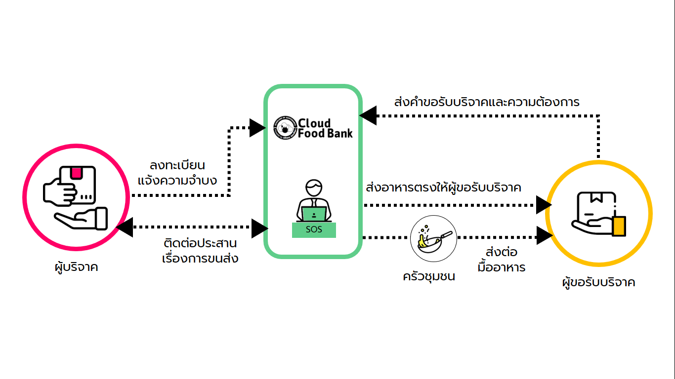ระบบคลาวด์ ฟู้ด แบงค์ (Cloud Food Bank) เป็นแพลตฟอร์มที่สนับสนุนการจัดทำโดย อลิอันซ์ อยุธยา ประกันชีวิต ทำหน้าที่เชื่อมโยงผู้ที่ต้องการบริจาคอาหาร และกลุ่มคนที่ขาดแคลนอาหารมาเจอกัน โดยมีมูลนิธิเอสโอเอส โครงการรักษ์อาหาร (SOS Thailand) เป็นตัวกลางในการจัดสรรการรับและการส่งต่ออาหารอย่างเป็นระบบ โดยผู้บริจาคและผู้รับบริจาค ต้องลงทะเบียนผ่านระบบ เพื่อให้มูลนิธิสามารถตรวจสอบและติดต่อประสานงานได้ โดยปัจจุบันยังกำหนดให้ผู้รับบริจาคเป็นกลุ่มบุคคล เช่น หัวหน้าชุมชน องค์กรสาธารณะที่มีภารกิจในการดูแลผู้ด้อยโอกาส เป็นต้น โดยประเภทอาหารที่ต้องการ ได้แก่ อาหารกระป๋อง อาหารปรุงสาเร็จ ของว่าง (Boxset) ข้าวสาร เส้นก๋วยเตี๋ยว อาหารแห้ง ขนมปัง Bakery ผัก ผลไม้ นม นมผง ผลิตภัณฑ์จากนม เนื้อสัตว์ เนื้อสัตว์แช่แข็ง กระดูกไก่ ไข่ เต้าหู้ น้ำดื่ม น้ำผลไม้ เครื่องปรุงต่าง ๆ อาทิ น้ำมัน น้ำปลา น้ำส้มสายชู เป็นต้น