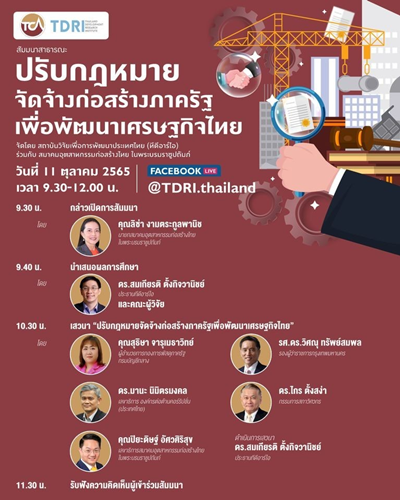 ดร.สมเกียรติ ตั้งกิจวานิชย์ ประธานสถาบันวิจัยเพื่อการพัฒนาประเทศไทย (ทีดีอาร์ไอ) เปิดเผยผลการศึกษา "การศึกษาปรับปรุงกฎหมายการจัดซื้อจัดจ้างภาครัฐเพื่อสร้างความโปร่งใส เป็นธรรม คุ้มค่า และเอื้อต่อการพัฒนาอุตสาหกรรมก่อสร้าง" พบว่า อุตสาหกรรมก่อสร้างมีความสำคัญสูงต่อเศรษฐกิจไทย แต่กำลังเผชิญกับการเปลี่ยนแปลงครั้งใหญ่ จึงต้องยกระดับมาตรฐานเพื่อรับมือความท้าท้าย ซึ่งการจัดจ้างก่อสร้างภาครัฐมีความสำคัญอย่างมากในการกำหนดทิศทางอุตสาหกรรมก่อสร้าง เนื่องจากการจัดจ้างก่อสร้างภาครัฐมีมูลค่าเกือบร้อยละ 60 ของอุตสาหกรรมก่อสร้างทั้งหมด