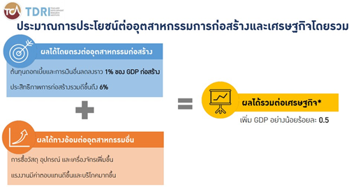 โดยจากการศึกษาพบว่าเพียงแค่การปรับปรุงแก้ไขกฎระเบียบและแนวทางปฏิบัติ ให้เบิกจ่ายตรงเวลามากขึ้น และลดเวลาการหยุดชะงักของงานลง สามารถช่วยให้ GDP ขยายตัวกว่าร้อยละ 0.5 เนื่องจากการเบิกจ่ายที่ตรงเวลาจะช่วยลดต้นทุนการเงินได้ราว 6,200 ล้านบาท หรือราวร้อยละ 1 ของ GDP ภาคก่อสร้าง และการลดการหยุดชะงักจะเพิ่มประสิทธิภาพการก่อสร้างทั้งอุตสาหกรรมราวร้อยละ 6
