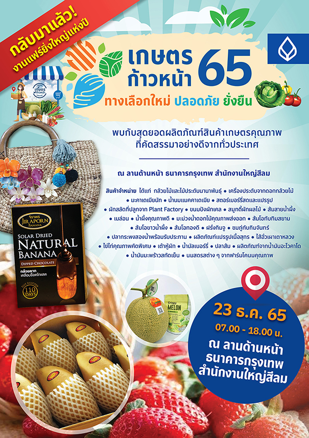 ธนาคารกรุงเทพ จำกัด (มหาชน) นำโดย นายเดชา ตุลานันท์ ประธานกรรมการบริหาร และนายทัฬห์ สิริโภคี ผู้ช่วยผู้จัดการใหญ่ สายลูกค้าธุรกิจรายปลีก จัดงาน “วันเกษตรก้าวหน้า ประจำปี 2565” ภายใต้แนวคิด “ทางเลือกใหม่ ปลอดภัย ยั่งยืน” พบผลผลิตทางการเกษตร สินค้าเกษตรแปรรูปเพื่อสุขภาพ ที่ได้รับมาตรฐานคุณภาพและความปลอดภัยในระดับสากล จากเกษตรกรก้าวหน้า จำนวน 42 ราย/บูธ อาทิ กล้วยไม้และไม้ประดับนานาพันธุ์, เครื่องประดับจากดอกกล้วยไม้, แมคคาเดเมียนัท, น้ำนมแมคคาเดเมีย, สตอร์เบอร์รี่สดและแปรรูป, ผักสลัดที่ปลูกจาก Plant Factory, ส้มสายน้ำผึ้ง, เมล่อน, น้ำผึ้งคุณภาพดี, มะม่วงน้ำดอกไม้คุณภาพส่งออก, ส้มโอทับทิมสยาม, ส้มโอขาวน้ำผึ้ง, ส้มโอทองดี, ปลากระพงสองน้ำพร้อมรับประทาน, ไข่ไก่คุณภาพคัดพิเศษ, ผลิตภัณฑ์แปรรูปเกรดส่งออก, นมสดรสต่างๆ จากฟาร์มโคนมคุณภาพ และสินค้าอีกมากมาย ในวันศุกร์ ที่ 23 ธันวาคม 2565 ตั้งแต่เวลา 08.30 – 17.00 น. ที่ลานด้านหน้าธนาคารกรุงเทพ สำนักงานใหญ่ ถนนสีลม