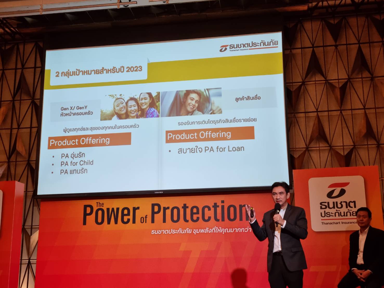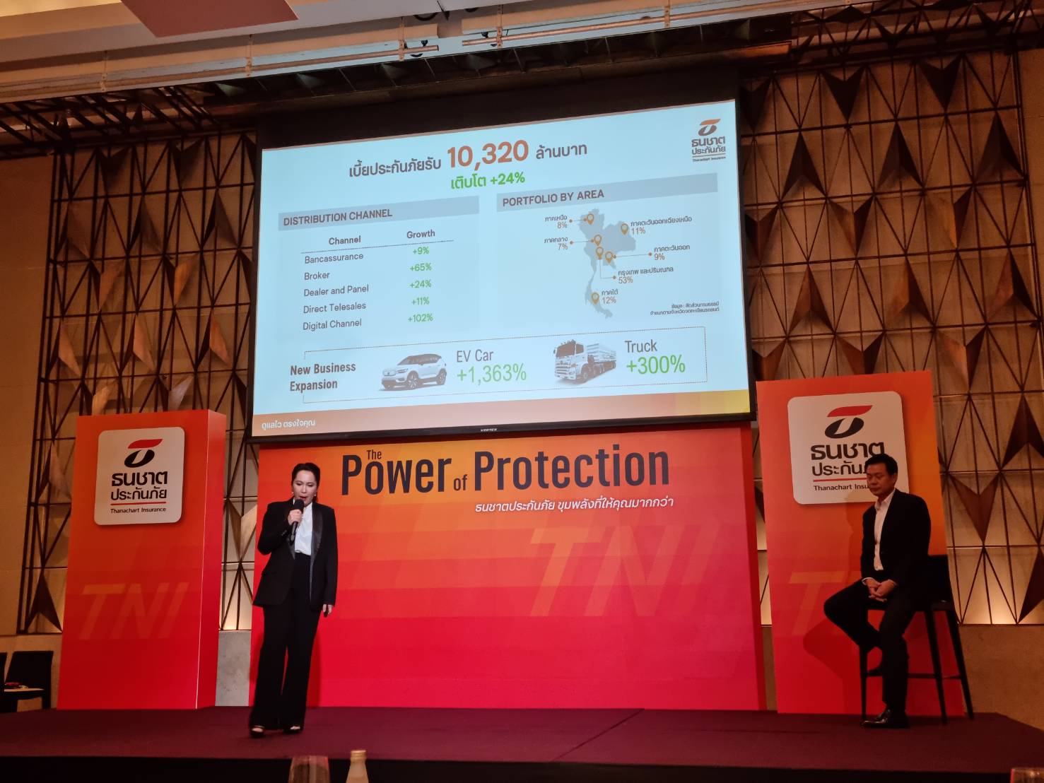 1. The power of protection. พลังของการดูแลความเสี่ยงให้กับลูกค้าได้ครอบคลุมและตรงกับความต้องการ ในปีนี้จะมุ่งขยายตลาดประกันภัยรถยนต์พลังงานไฟฟ้า (EV) และประกันภัยคุ้มครองรถบรรทุก (Truck) โดยตลาดรถยนต์ไฟฟ้าจะบุกทั้งป้ายแดงและปีต่ออายุ เน้นให้ความคุ้มครองครอบคลุมทุกกรณี ด้วยเบี้ยประกันภัยที่เหมาะสมใกล้เคียงกับรถยนต์สันดาป พร้อมบริการหลังการขายระดับพรีเมี่ยมมาตรฐานของธนชาตประกันภัย โดยเฉพาะความกังวลเรื่องแบตเตอรี่รถหมดระหว่างการเดินทาง มีบริการช่วยเหลือฉุกเฉินประสานรถยกไปจุดชาร์ตที่ใกล้ที่สุดในรัศมี 20 กม. รวมถึงการพัฒนาบริการครบวงจร เพื่อมุ่งสู่ความเป็นผู้นำในตลาดประกันภัยรถไฟฟ้า นอกจากนี้ได้ขยายความเชี่ยวชาญไปยังตลาดรถบรรทุกใหญ่ด้วยการพัฒนาผลิตภัณฑ์ประกันภัยรถบรรทุกใหญ่ ที่มีทั้งแบบประเภท 1 สำหรับรถบรรทุกใหญ่อายุ 1-10 ปี และประเภท 2+ สำหรับรถบรรทุกใหญ่อายุเกิน 10 ปี ในรูปแบบแพ็กเกจที่เข้าใจง่าย มีความชัดเจนเรื่องทุนประกันภัยและเบี้ยประกันภัย เพื่อให้ลูกค้าตัดสินใจซื้อได้ง่าย ในขณะเดียวกันจะเพิ่มสัดส่วนในผลิตภัณฑ์ประกันภัยคุ้มครองสินเชื่อ ประกันภัยคุ้มครองอุบัติเหตุส่วนบุคคลสำหรับกลุ่มครอบครัว เพื่อช่วยบริหารจัดการความเสี่ยงด้านการเงินให้กับลูกค้าด้วย