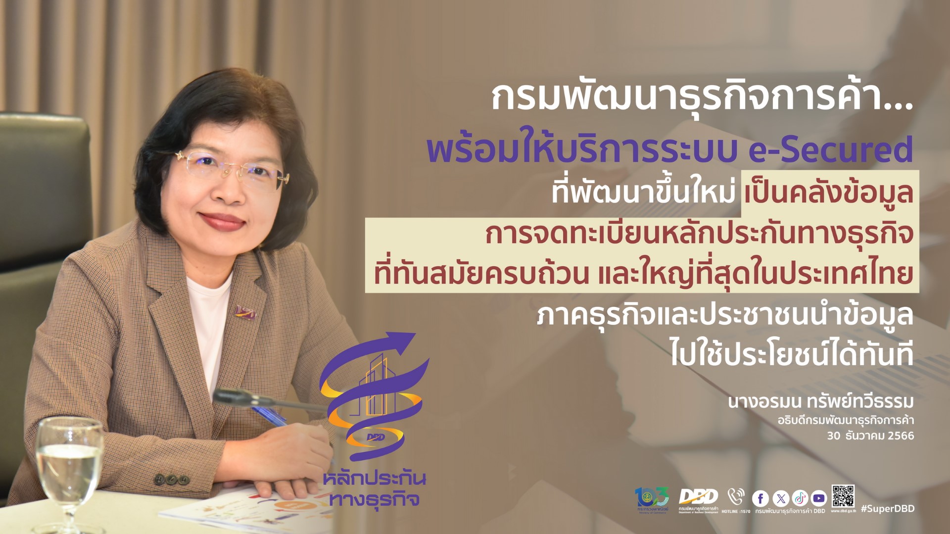 ล่าสุด กรมฯ ได้พัฒนาระบบจดทะเบียนหลักประกันทางธุรกิจทางอิเล็กทรอนิกส์ (e-Secured) ขึ้นใหม่ เพื่อเพิ่ม ประสิทธิภาพการให้บริการที่ดียิ่งขึ้นและเป็นมิตรกับผู้ใช้งานมากที่สุด เน้นให้ผู้เกี่ยวข้องสามารถนำข้อมูลไปใช้ประโยชน์ได้ทันที โดยข้อมูลมีความถูกต้อง ครบถ้วน เป็นปัจจุบัน ที่สำคัญ ระบบใช้งานง่ายมากขึ้น สะดวก รวดเร็ว ช่วยประหยัดเวลาและค่าใช้จ่ายให้ภาคธุรกิจและประชาชน เป็นการให้บริการจดทะเบียนสัญญาหลักประกันทางธุรกิจผ่านระบบออนไลน์ที่ครบวงจร ทั้งการขึ้นทะเบียนและการยืนยันตัวตนผู้รับหลักประกัน การจดทะเบียนฯ การตรวจค้นข้อมูลสัญญาหลักประกันทางธุรกิจ การขอรับใบอนุญาตและการตรวจดูรายชื่อผู้บังคับหลักประกัน การแสดงสถิติทางทะเบียนได้พัฒนาใหม่ในรูปแบบ Dashboard ที่ทันสมัยและอัพเดทข้อมูลตลอดเวลา ประชาชนและผู้ประกอบธุรกิจสามารถนำข้อมูลหรือสถิติไปประกอบการตัดสินใจดำเนินธุรกรรมได้ทันที ทั้งนี้ ระบบการจดทะเบียนฯ ที่พัฒนาขึ้นใหม่เป็นคลังข้อมูลการจดทะเบียนหลักประกันทางธุรกิจที่มีความทันสมัย ครบถ้วน และใหญ่ที่สุดในประเทศไทย จะเปิดให้บริการตั้งแต่เดือนมกราคม 2567 เป็นต้นไป ผ่านทาง www.dbd.go.th >> บริการออนไลน์ >> การจดทะเบียนธุรกิจ >> จดทะเบียนสัญญาหลักประกันทางธุรกิจ (e-Secured)