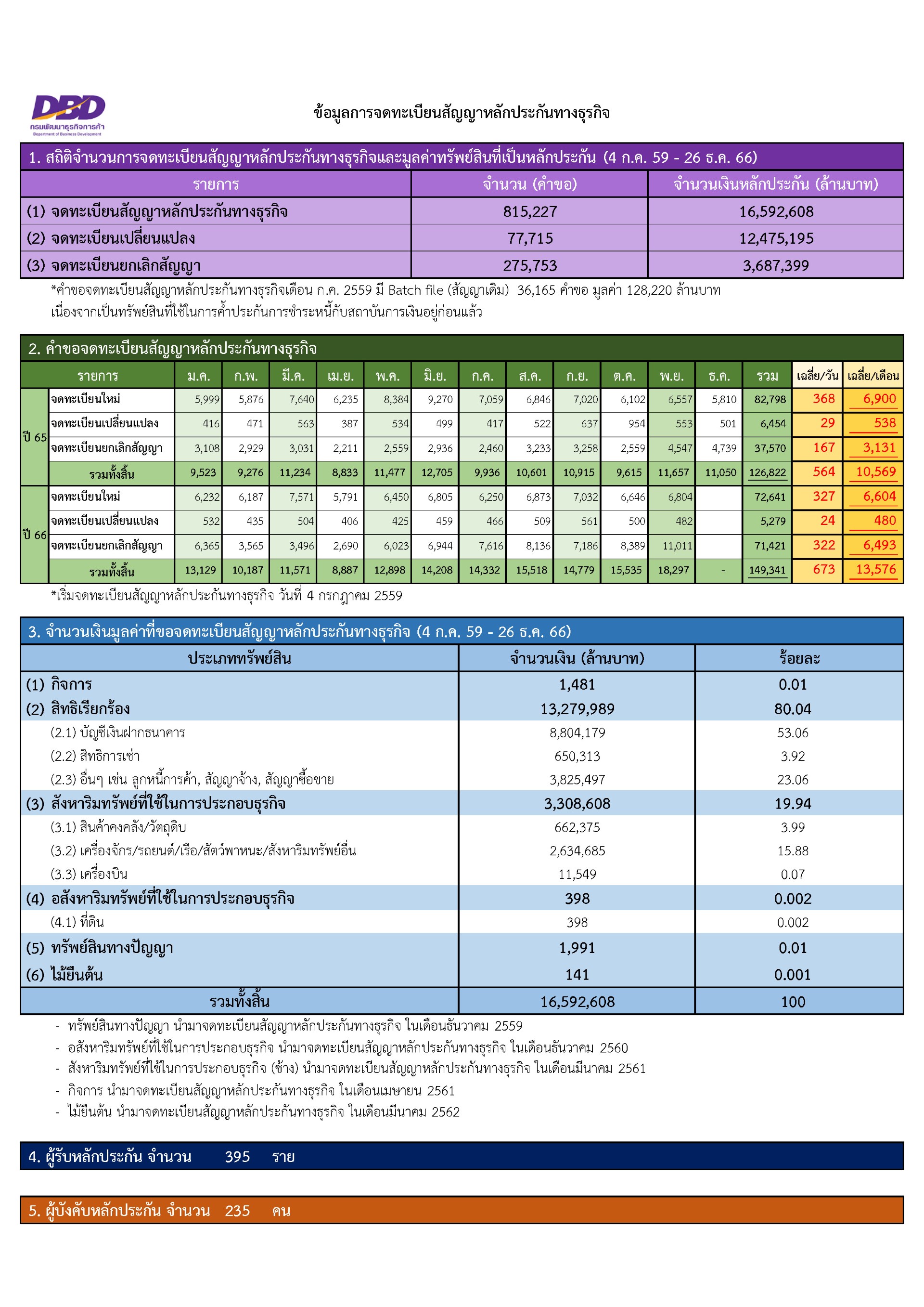 ปัจจุบัน (วันที่ 27 ธันวาคม 2566) มีคำขอจดทะเบียนสัญญาหลักประกันทางธุรกิจจำนวนทั้งสิ้น 815,227 คำขอ ทรัพย์สินรวมที่ใช้เป็นหลักประกันจำนวน 16,592,608 ล้านบาท โดยสิทธิเรียกร้องเป็นทรัพย์สินที่ใช้เป็นหลักประกันมากที่สุด ร้อยละ 80.04 (มูลค่า 13,279,989 ล้านบาท) รองลงมา สังหาริมทรัพย์ที่ใช้ ในการประกอบธุรกิจ ได้แก่ สินค้าคงคลัง วัตถุดิบ เครื่องจักร รถยนต์ เรือ เครื่องบิน สัตว์พาหนะ ร้อยละ 19.94 (มูลค่า 3,308,608 ล้านบาท) ทรัพย์สินทางปัญญา ร้อยละ 0.01 (มูลค่า 1,991 ล้านบาท) กิจการ ร้อยละ 0.01 (มูลค่า 1,481 ล้านบาท) อสังหาริมทรัพย์ที่ใช้ในการประกอบธุรกิจ ร้อยละ 0.002 (มูลค่า 398 ล้านบาท)