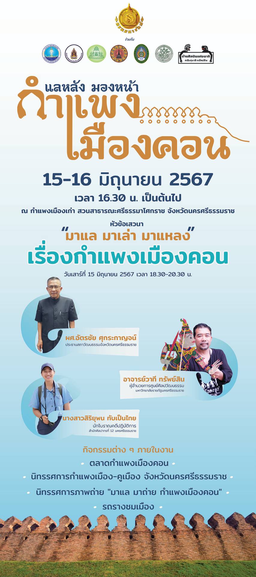 นายจำเริญ โพธิยอด อธิบดีกรมธนารักษ์ เปิดเผยว่า กรมธนารักษ์ร่วมกับเครือข่ายความร่วมมือจัดกิจกรรมถ่ายทอดองค์ความรู้ประวัติศาสตร์กำแพงเมือง-คูเมือง จังหวัดนครศรีธรรมราช ระหว่างวันที่ 15-16 มิถุนายน 2567 บริเวณกำแพงเมืองเก่า สวนสาธารณะศรีธรรมาโศกราช จังหวัดนครศรีธรรมราช ภายในงานพบกับกิจกรรมมากมาย อาทิ กิจกรรมเสวนาในหัวข้อ “มาแล มาเล่า มาแหลง เรื่องกำแพงเมืองคอน” ร่วมแลกเปลี่ยนความรู้และประสบการณ์ด้านการอนุรักษ์ และการบริหารจัดการพื้นที่บริเวณกำแพงเมือง–คูเมืองจังหวัดนครศรีธรรมราช โดยวิทยากรผู้เชี่ยวชาญจากภาครัฐและภาคประชาสังคม ได้แก่ ผศ.ฉัตรชัย ศุกระกาญจน์ ประธานสภาวัฒนธรรมจังหวัดนครศรีธรรมราช อาจารย์วาที ทรัพย์สิน ผู้อำนวยการศูนย์ศิลปวัฒนธรรม มหาวิทยาลัยราชภัฎนครศรีธรรมราช และนางสาวสิริยุพิน ทับเป็นไทย นักโบราณคดีปฎิบัติการ สำนักศิลปากรที่ 12 นครศรีธรรมราช