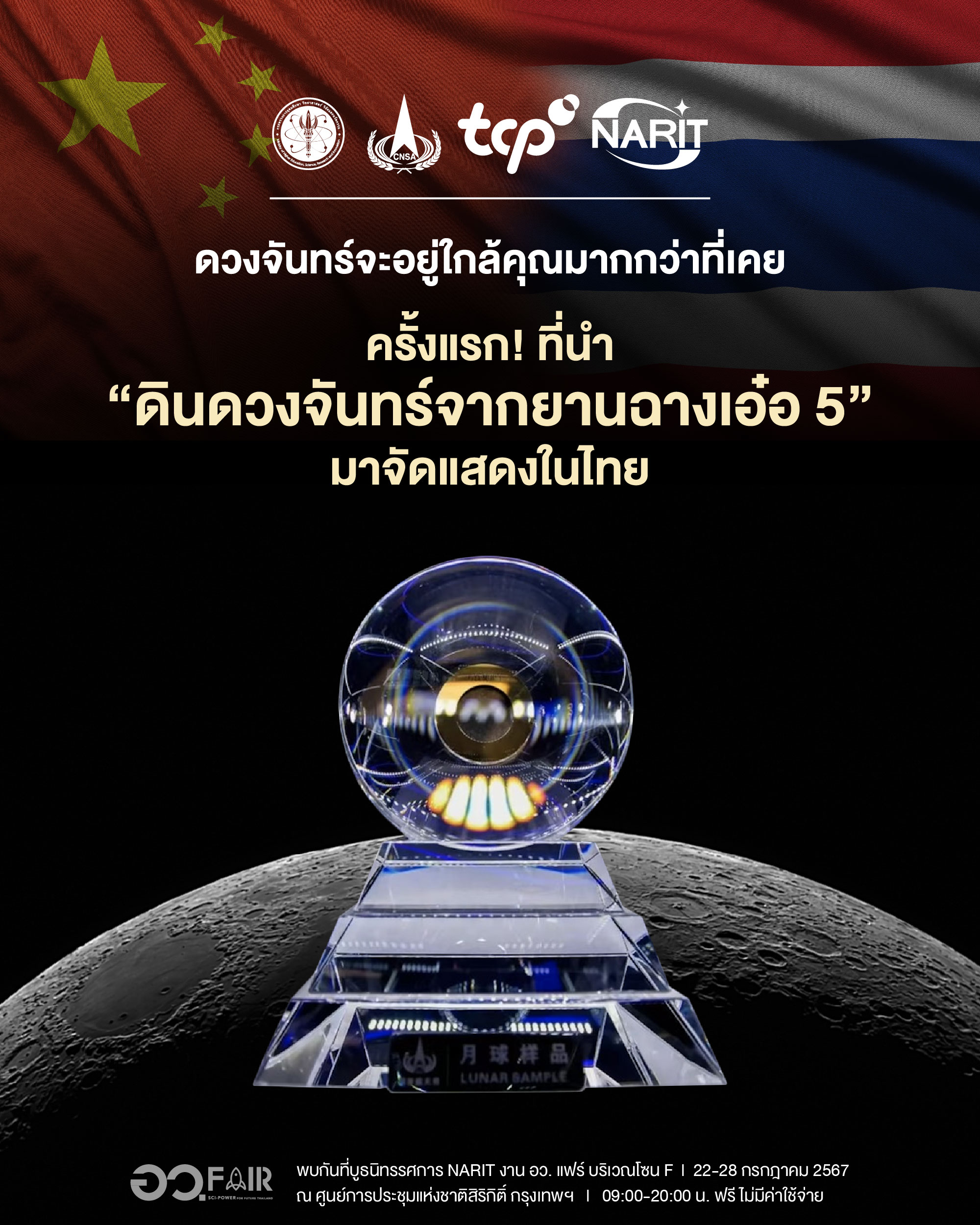 สถาบันวิจัยดาราศาสตร์แห่งชาติ (องค์การมหาชน) (สดร. หรือ NARIT) กระทรวงการอุดมศึกษา วิทยาศาสตร์ วิจัย และนวัตกรรม (อว.) ร่วมกับองค์การบริหารอวกาศแห่งชาติจีน (China National Space Administration: CNSA) ด้วยการสนับสนุนของกลุ่มธุรกิจ TCP ปลุกพลังให้คนไทยสนใจวิทยาศาสตร์ เทคโนโลยี และนวัตกรรม นำ “ดินดวงจันทร์จากยานฉางเอ๋อ 5” มาจัดแสดงในประเทศไทย และนับเป็นครั้งแรกที่จีนนำมาจัดแสดงนอกประเทศ ร่วมกับอุปกรณ์ปฏิบัติภารกิจวิทยาศาสตร์ของไทยที่จะติดตั้งไปกับยานฉางเอ๋อ 7 พร้อมนำเสนอผลงานการใช้โจทย์ดาราศาสตร์ ผลักดันให้เกิดการพัฒนาเทคโนโลยีและวิศวกรรมขั้นสูงด้านต่างๆ พบกันในงาน อว.แฟร์ : SCI POWER FOR FUTURE THAILAND (บูธนิทรรศการ NARIT บริเวณโซน F) ระหว่างวันที่ 22-28 กรกฎาคม 2567 ณ ศูนย์การประชุมแห่งชาติสิริกิติ์ กรุงเทพฯ สามารถเข้าชมงานได้ ตั้งแต่เวลา 09:00-20:00 น. ฟรี! ไม่มีค่าใช้จ่าย