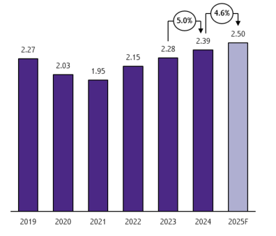 ท่ามกลางสถานการณ์ภาคครัวเรือนที่ยังมีความเปราะบางจากภาวะหนี้ภาคครัวเรือน รวมถึงราคาสินค้าที่ยังมีแนวโน้มอยู่ในระดับสูง ธุรกิจ Modern trade ยังมีแนวโน้มขยายตัวโดยได้รับปัจจัยหนุนจากโครงการกระตุ้นเศรษฐกิจภาครัฐ และภาคท่องเที่ยวที่ขยายตัวดีขึ้น โดยคาดว่ามูลค่าธุรกิจ Modern trade ในปี 2025 จะขยายตัวที่ 4.6%YOY ไปอยู่ที่ราว 2.5 ล้านล้านบาท