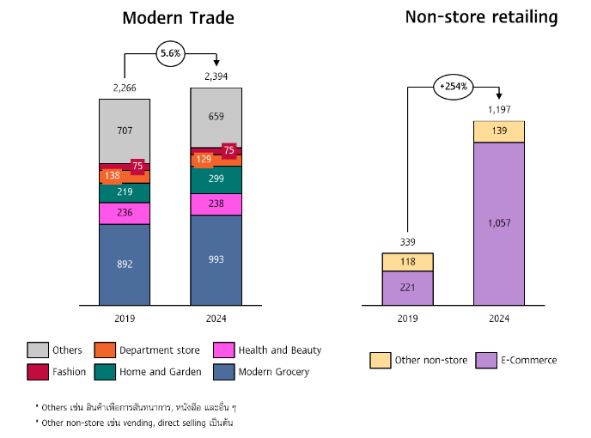 อนึ่ง พฤติกรรมการซื้อสินค้าและวิถีชีวิตของผู้บริโภคที่เปลี่ยนแปลงไป โดยเฉพาะอย่างยิ่งภายหลังการแพร่ระบาดของโควิด-19 คือจุดเปลี่ยนสำคัญที่มีส่วนช่วยหนุนให้มูลค่าตลาด E-commerce ในไทยเติบโตขึ้นอย่างรวดเร็ว โดยคาดการณ์ว่าสัดส่วนตลาด E-commerce มีแนวโน้มเพิ่มขึ้นอย่างต่อเนื่องไปอยู่ที่ราว 25% ของมูลค่าตลาดค้าปลีกทั้งหมดในปี 2025 เทียบกับปี 2019 ซึ่งอยู่เพียงแค่ราว 7% โดยส่วนหนึ่งเป็นผลจากการที่ร้านค้าหลายแห่งมีการปรับเปลี่ยนกลยุทธ์การตลาดโดยเพิ่มความหลากหลายของช่องทางการจัดจำหน่ายสินค้า ทั้งหน้าร้านและผ่านช่องทางออนไลน์ต่าง ๆ มากขึ้น รวมทั้งแนวโน้มของ Social commerce ซึ่งเป็นผลจากการผสมผสานกันระหว่าง E-marketplace และ Social media ที่ทยอยเข้ามามีบทบาทมากขึ้น และช่วยให้สามารถเข้าถึงผู้บริโภคได้อย่างสะดวกและครอบคลุมยิ่งขึ้น โดยเฉพาะกลุ่ม Gen Z ที่กำลังเริ่มเข้ามาสู่ตลาดแรงงานและเริ่มมีศักยภาพในการจับจ่ายที่สูงขึ้น