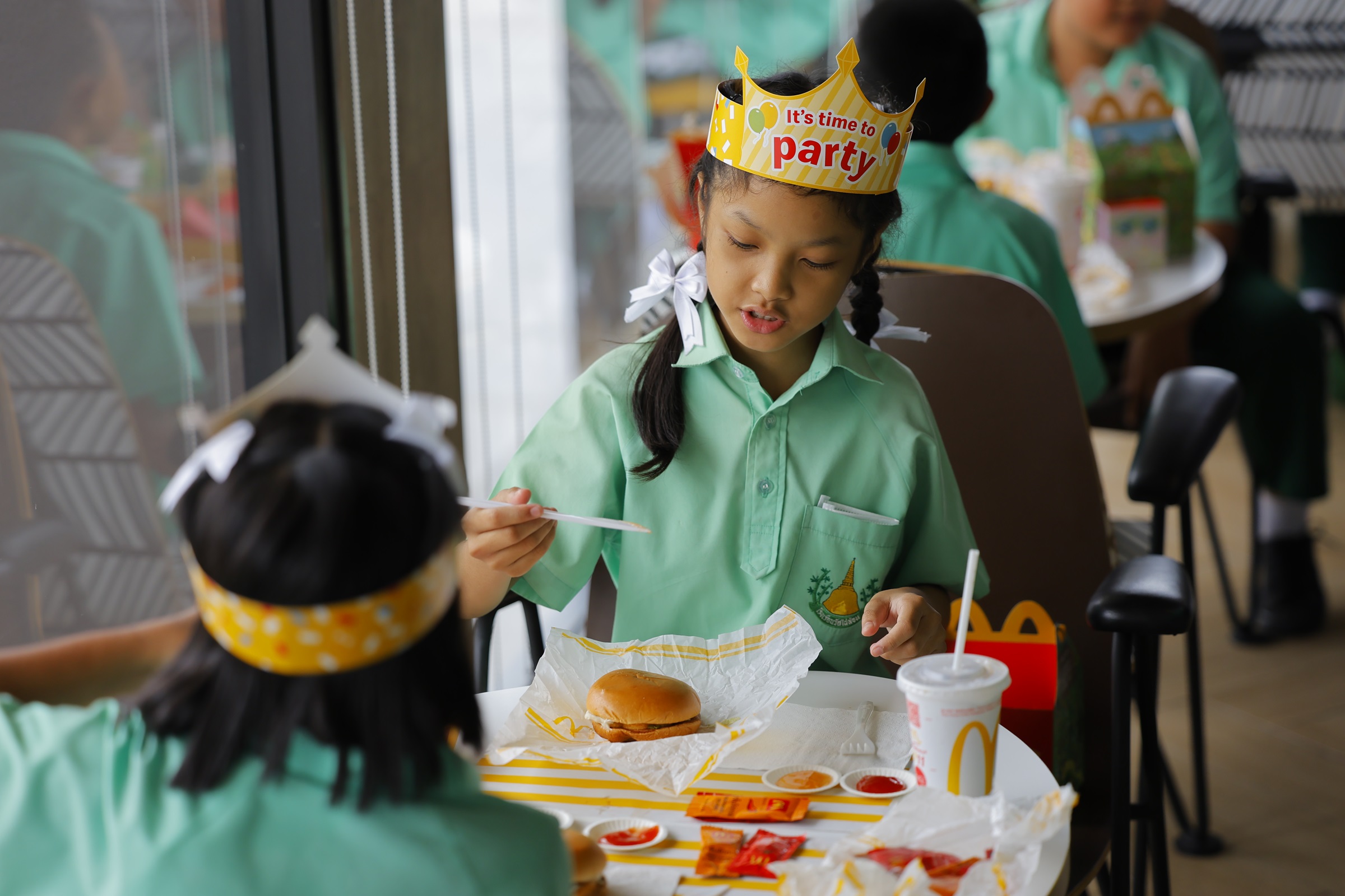 สำหรับโครงการพัฒนาสังคม ‘McHappy Smile’ ออกแบบมาเพื่อมอบประสบการณ์ความสุขแบบครบวงจร และสร้างความประทับใจให้กับน้องๆ โดยไม่เพียงแต่เน้นเรื่องความสนุกสนานเท่านั้น แต่ยังรวมถึงการเปิดโลกทัศน์ให้เด็กๆ ได้สัมผัสกับการบริการมาตรฐานระดับโลกของแมคโดนัลด์อย่างใกล้ชิด เริ่มตั้งแต่ โชว์แบบเพลินๆ (Play+Learn) จากพี่โรนัลด์และผองเพื่อน ที่สอดแทรกความรู้ในการดูแลตัวเองออกกำลังกายอย่างเหมาะสม นอกจากนั้นน้องๆ ในโครงการจะได้เปิดโลกผ่านทัวร์ร้านแมคโดนัลด์ เพื่อช่วยฝึกทักษะและสร้างเสริมประสบการณ์ชีวิตผ่านการเรียนรู้นอกห้องเรียนจากบรรยากาศการทำงานหน้าร้านจริง ตั้งแต่จุดสั่งซื้อสินค้าหน้าเคาน์เตอร์ การบริการเครื่องสั่งอาหารอัตโนมัติ สาธิตการทำงานในห้องครัว รวมถึงการบริการของแมคไดรฟ์ทรู เพื่อเรียนรู้การทำงานเป็นทีม และการส่งมอบความสุขผ่านบริการที่รวดเร็วและมีประสิทธิภาพ นอกจากนั้นน้องๆ ยังได้มีช่วงเวลาสุดพิเศษกับ ‘Birthday Party’ เพื่อให้น้องๆ ได้ร่วมฉลองช่วงเวลาแห่งความสุขร่วมกันผ่านเมนูอาหารกลางวันที่จัดเตรียมอย่างพิถีพิถัน ภายใต้มาตรฐานความปลอดภัยและคุณภาพระดับโลกของแมคโดนัลด์ เป็นการเติมเต็มรอยยิ้มและความทรงจำดีๆ ให้กับเด็กๆ