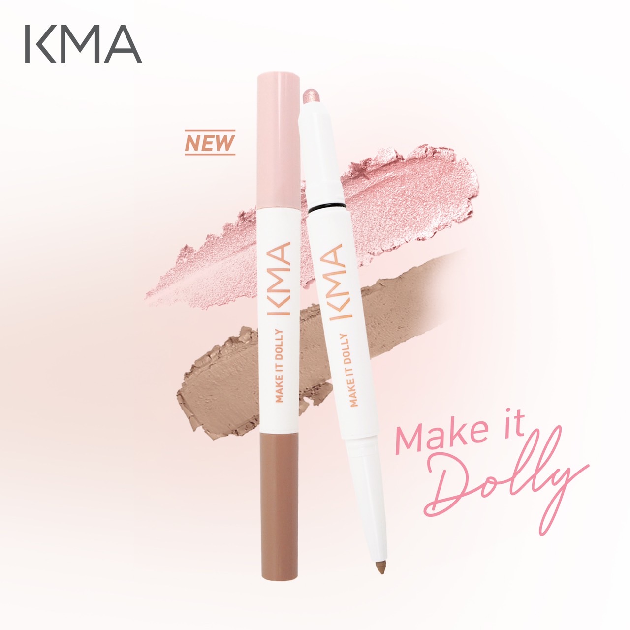 KMA MAKE IT DOLLY (เคเอ็มเอ เมค อิท ดอลลี่) ปากกาดอลลี่อาย 2 in1 รวม 2 เฉดสี ในแท่งเดียว มีทั้งชิมเมอร์โทนสว่าง และแมตต์โทนน้ำตาลธรรมชาติ ที่จะเนรมิตดวงตาให้ดูกลมโต หวานฉ่ำ เขียนง่าย นุ่มลื่น ติดทนนาน ไม่หลุดระหว่างวัน พิเศษด้วยสูตร Vegan & 5-Free เป็นมิตรกับผิว อ่อนโยนต่อดวงตา ปราศจากแอลกอฮอล์ พาราเบน และมีวิตามินอีช่วยเพิ่มความชุ่มชื้น ไม่รู้สึกเหนียวเหนอะหนะ มาพร้อม 2 เฉดสี ROSY TWINKLE ชมพูหวานเปล่งประกาย และ เฉดสี GOLDEN GLOW ให้ลุคแลดูสุขภาพดี จำหน่ายในราคา 290 บาท