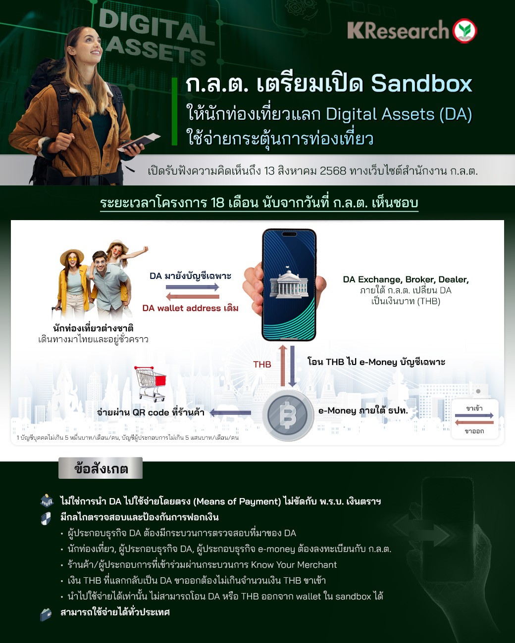 • นักท่องเที่ยวต่างชาติที่เข้ามาในประเทศจะต้องลงทะเบียนเพื่อเปิดบัญชีกับผู้ประกอบธุรกิจ DA และ e-Money ที่อยู่ภายใต้การกำกับของ ก.ล.ต. และ ธปท. เพื่อเปิดบัญชีเฉพาะในการแลก DA เป็นเงินบาท และนำไปใช้จ่ายที่ร้านค้า ผ่าน QR-Code หรือช่องทางอิเล็กทรอนิกส์อื่นตามที่กำหนด ซึ่งจะเห็นว่า มีการกำหนดหลักเกณฑ์หลายขั้นตอนเพื่อป้องกันความเสี่ยง และมีการกำหนดขอบเขตการใช้บริการที่นักท่องเที่ยวต่างชาติสามารถทำได้ใน Sandbox ไว้อย่างชัดเจน