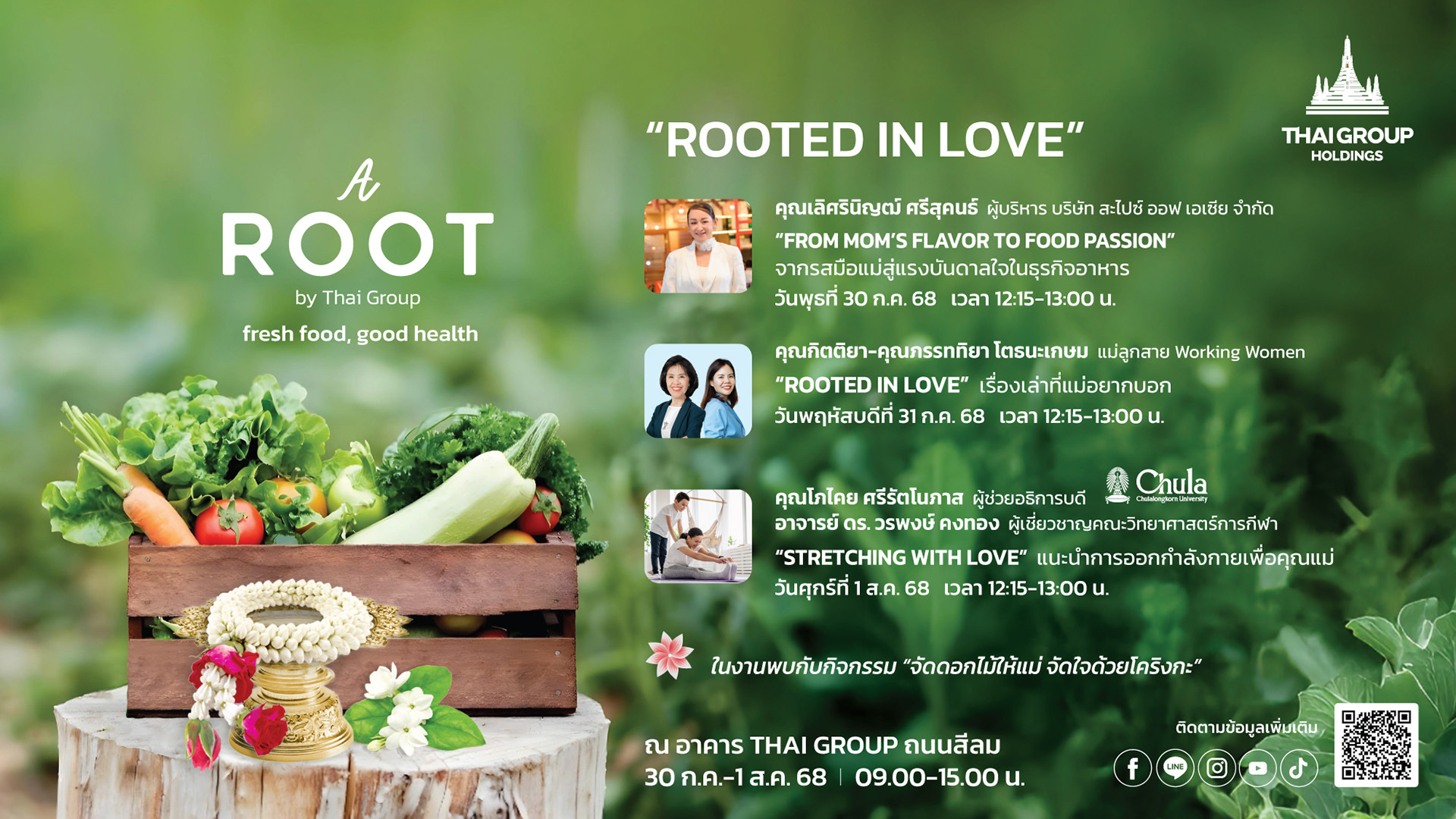 บริษัท ไทยกรุ๊ป โฮลดิ้งส์ จำกัด (มหาชน) กลุ่มธุรกิจประกันและการเงินในเครือทีซีซี เชิญชวนทุกท่านร่วมฉลองเทศกาลวันแม่ด้วยความสุข ประทับใจทุกโมเมนต์กับกิจกรรมที่จะสร้างแรงบันดาลใจ ส่งต่อความรู้สึกดี ๆ ในครอบครัว พร้อมเพลิดเพลินกับการชอปเมนูอร่อย และสินค้าสุขภาพ ในงาน “A ROOT By Thai Group” คอมมูนิตี้เพื่อการดูแลสุขภาพ เสริมสร้างสุขภาวะที่ดีทั้งกายและใจ ระหว่างวันที่ 30 กรกฎาคม - 1 สิงหาคม 2568 ตั้งแต่เวลา 09.00 - 15.00 น. ณ บริเวณล็อบบี้ และ A Root Space อาคารไทยกรุ๊ป สำนักงานใหญ่ ถนนสีลม