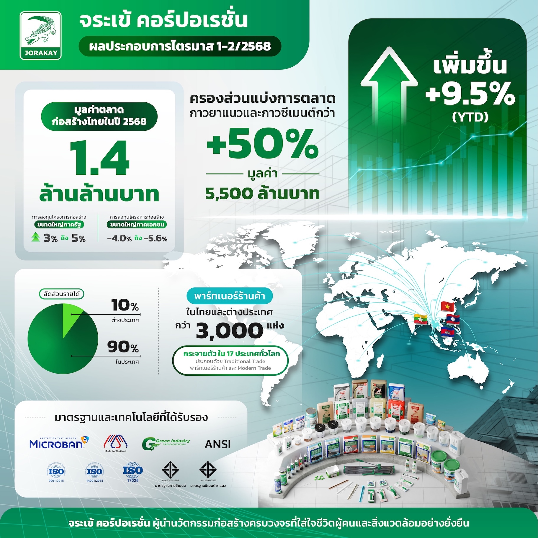 บริษัท จระเข้ คอร์ปอเรชั่น จำกัด ตัวจริงนวัตกรรมก่อสร้างครบวงจรด้วยสินค้าคุณภาพครอบคลุมงานก่อสร้าง ซ่อมแซม และตกแต่งตั้งแต่รากฐานถึงหลังคา เผยผลประกอบการครึ่งปีแรกของปี 2568 เติบโต 9.5% เทียบกับช่วงเวลาเดียวกันในปีก่อนหน้า และคาดว่าจะสามารถบรรลุเป้าหมายที่ตั้งไว้ได้ ท่ามกลางความท้าทายของเศรษฐกิจไทยและการแข่งขันที่ดุเดือดมากขึ้น บริษัทยืนหยัดด้วยแนวคิด "Build Today, Beyond Tomorrow" สร้างวันนี้ เพื่อพรุ่งนี้ที่ยั่งยืนกว่า ผ่านนวัตกรรมสินค้าก่อสร้างที่มีคุณภาพได้มาตรฐานในทุกกระบวนการผลิต ความสำเร็จในปีนี้เกิดจากแผนกลยุทธ์ที่ชัดเจนในการรับมือความท้าทายและการรองรับดีมานด์ใหม่ ๆ ทั้งการเพิ่มขึ้นของความต้องการวัสดุก่อสร้างสำหรับงานซ่อมแซมและเสริมความแข็งแรงหลังเหตุการณ์แผ่นดินไหว การเติบโตอย่างต่อเนื่องของโครงการก่อสร้างภาครัฐและอสังหาริมทรัพย์ รวมถึงการขยายตัวในตลาดต่างประเทศและผลิตภัณฑ์ใหม่ที่เริ่มสร้างยอดขายได้ดี