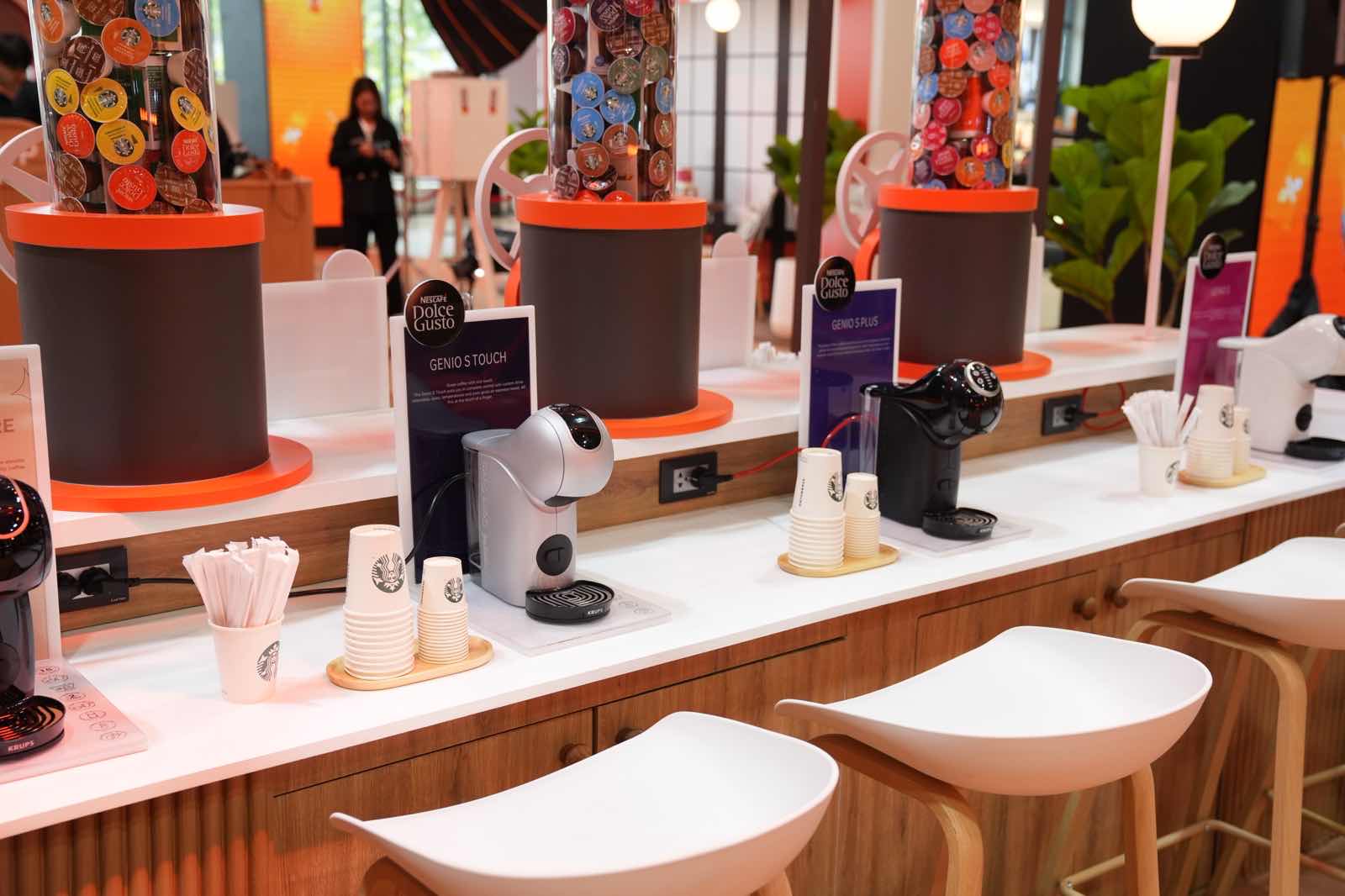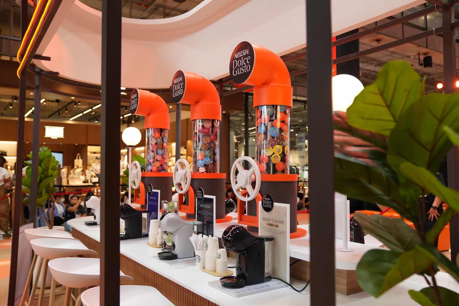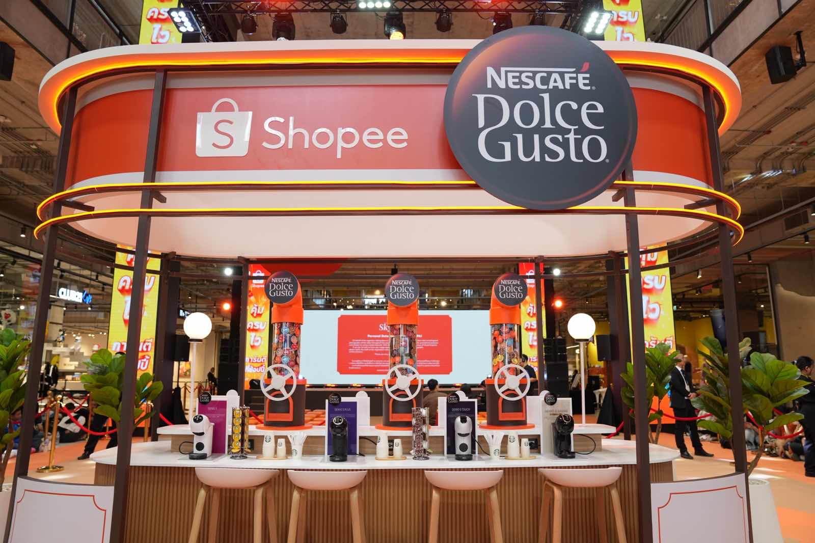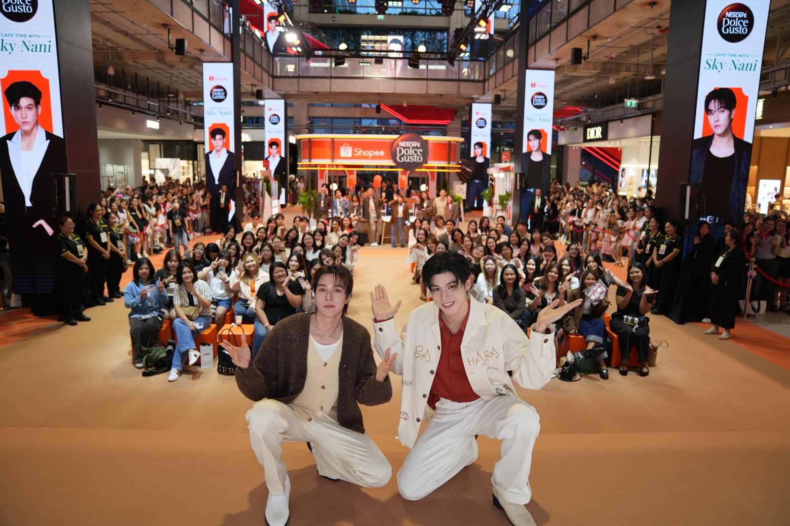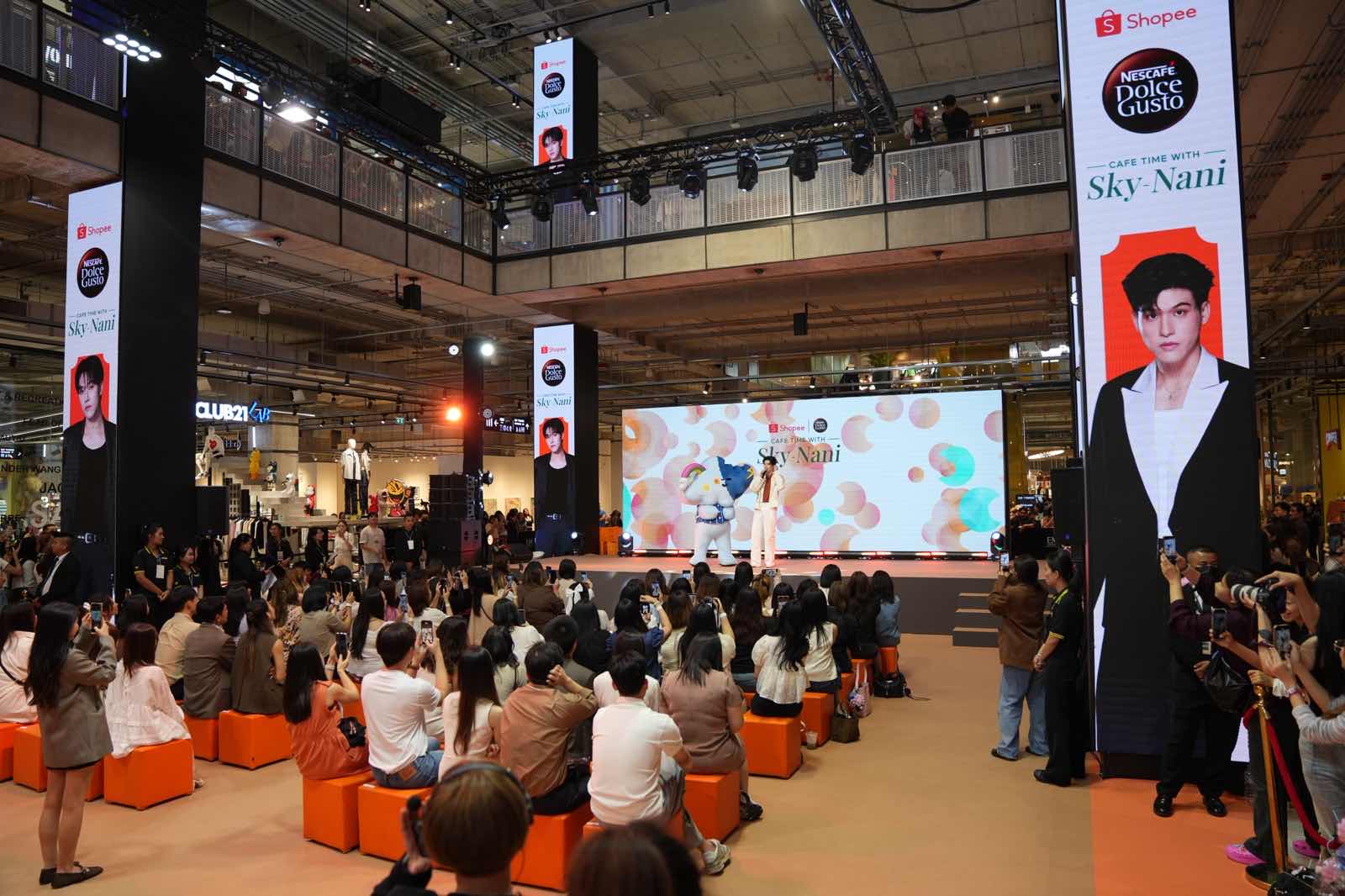 บรรยากาศภายในงาน Shopee l Dolce Gusto Cafe Time with Sky-Nani ถูก ตกแต่งขึ้นให้เสมือน เป็นมุมกาแฟที่สุดแสนจะผ่อนคลาย รายล้อมไปด้วยผลิตภัณฑ์เครื่อง ชงกาแฟและแคปซูลกาแฟ จาก เนสกาแฟ ดอลเช่ กุสโต้ ที่ช่วยเพิ่มกลิ่นอายความ รู้สึกแบบร้าน cafe Specialty โดยมีผู้โชคดีที่ได้รับสิทธิ์ทั้ง 50 ท่าน จากการร่วม กิจกรรมซื้อสินค้าที่ร่วมรายการใน Nescafe Dolce Gusto Official Shop ในช้อปปี้ มาร่วมภายในงานกันอย่างอบอุ่น ก่อนจะเริ่มต้นงานด้วยโชว์การแสดงพิเศษจาก สกาย-นานิ ที่เรียกเสียง กรี๊ดดังสนั่น จากนั้นทั้งสองหนุ่มมาร่วมพูดคุยแชร์โมเมนต์ความประทับใจ ก่อนจะเข้าสู่ช่วงไฮไลต์ที่ สกาย-นานิ จะต้องครีเอทเมนูพิเศษเพื่อเป็นเป็นของขวัญ โดยใช้เครื่องชงกาแฟเนสกาแฟ ดอลเช่ กุสโต้ ที่สองหนุ่มทำกันได้แบบสะดวกสบาย งานนี้บอกเลยว่าแฟนๆ ช่วยกันชงเนสกาแฟ ดอลเช่ กุสโต้ ติดหวานแบบไม่ต้อง ใส่น้ำตาล จากนั้นก็ร่วมเล่นเกมกับผู้โชคดี พร้อมกิจกรรมแจกลายเซ็น มอบของที่ระลึก สุดน่ารักและถ่ายภาพร่วมกัน เรียกว่ามีครบทุกรสชาติแบบกลมกล่อม