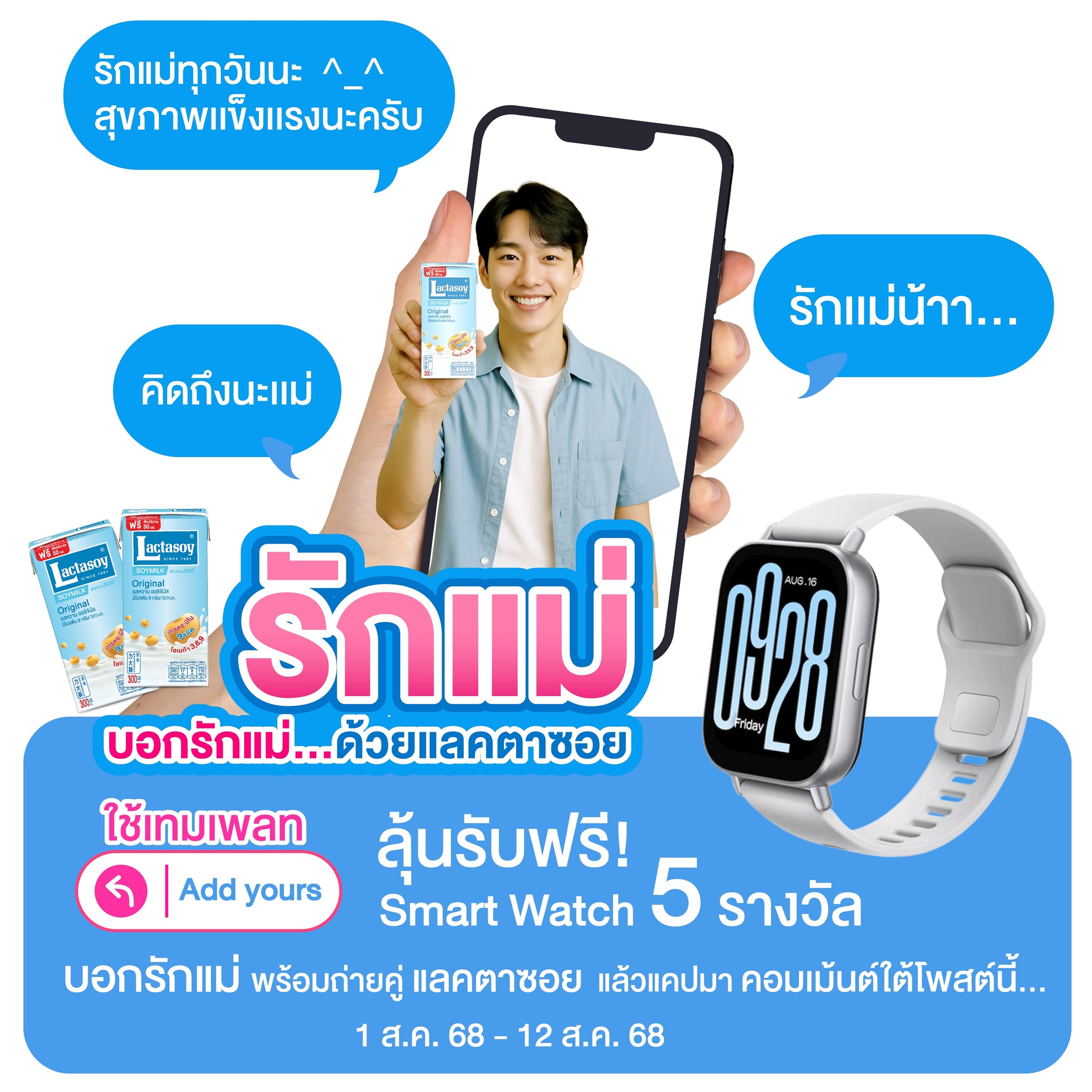 วันแม่ปีนี้ มาบอกรักแม่กับแลคตาซอย ลุ้นรับ Smart Watch ให้คุณแม่ใส่เช็กสุขภาพกันฟรีๆ ถึง 5 รางวัล เพียงกดไลก์และแชร์โพสต์กิจกรรมนี้ ตั้งค่าเป็นสาธารณะ จากนั้นถ่ายรูปคู่กับแลคตาซอยรสใดก็ได้ด้วยเทมเพลท Add yours ใน Highlight Story Instagram แท็ก Lactasoy แล้ว save ภาพใน story มาโพสในคอมเมนต์ใต้กิจกรรมนี้ในช่องทางเฟซบุ๊ก พร้อมบอกรักแม่ในแบบที่เป็นตัวคุณ ร่วมสนุกกันได้ตั้งแต่วันที่ 1-12 ส.ค. 2568 นี้ ประกาศรายชื่อผู้โชคดี 15 ส.ค. 2568 ดูรายละเอียดเพิ่มเติมได้ที่ https://bit.ly/3w0PQ5o