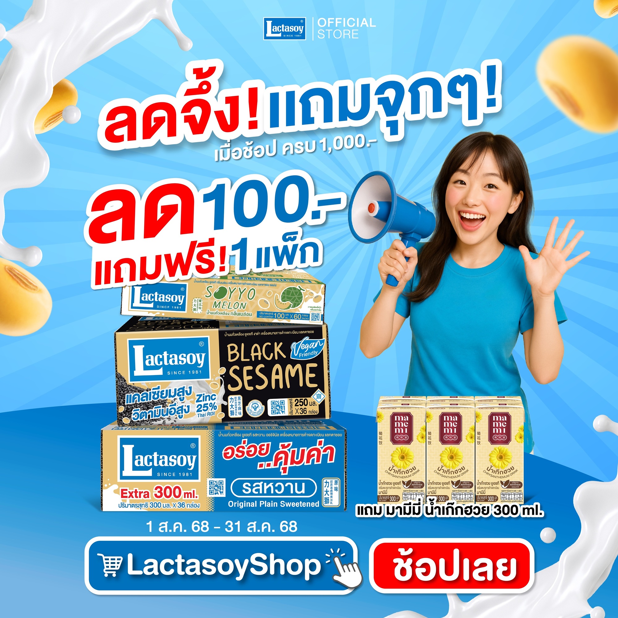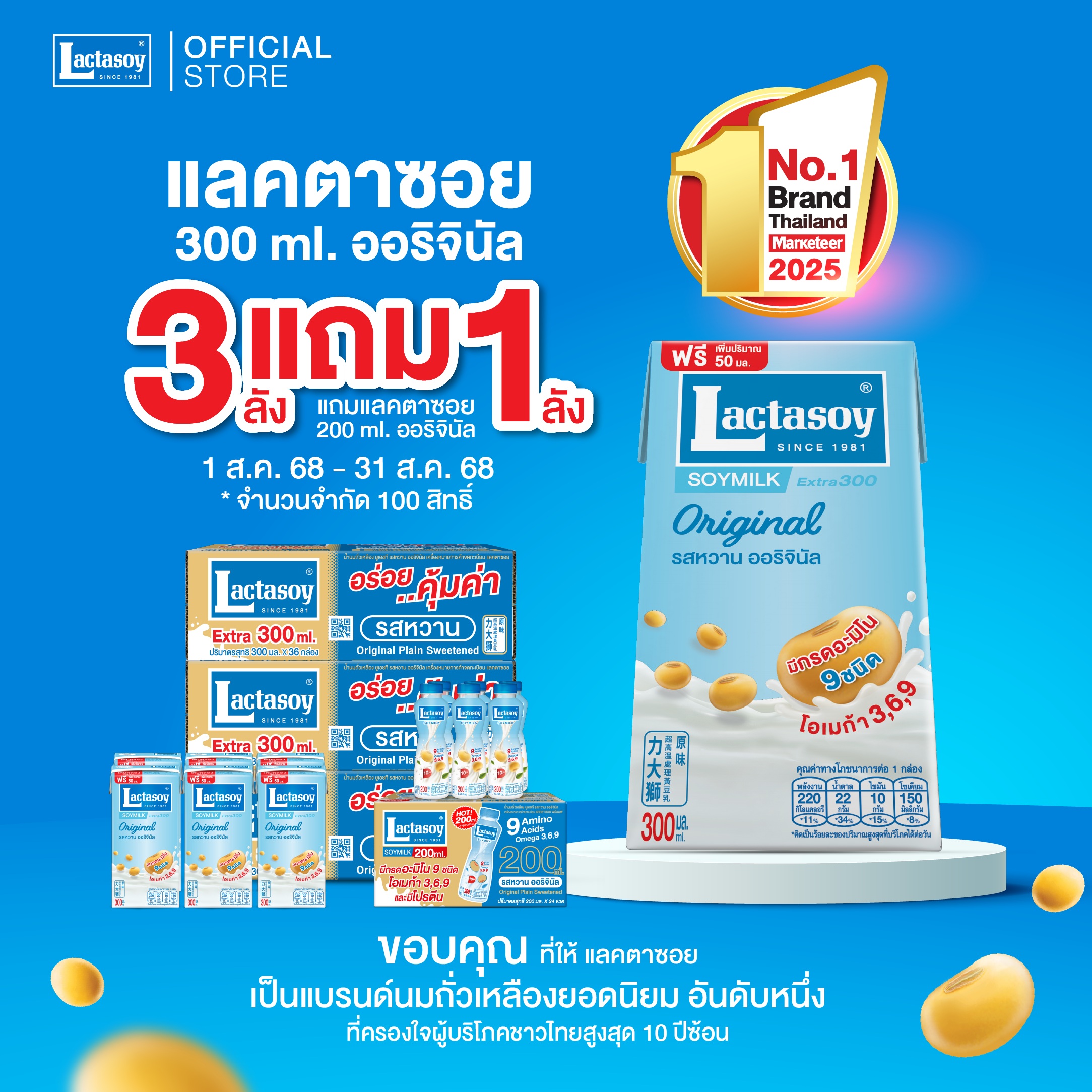 ในโอกาสที่แลคตาซอยได้เป็นแบรนด์นมถั่วเหลืองอันดับ 1 ในใจคนไทยติดต่อกัน 10 ปีซ้อน แลคตาซอยขอขอบคุณทุกความรักที่มีให้ และขอตอบแทนความไว้วางใจด้วยโปรสุดพิเศษ ตลอดเดือนสิงหาคม 2568 นี้ กับโปรคุ้มๆ ด้วยแลคตาซอยขนาด 300 มล. รสออริจินัล จำนวน 3 ลัง แถมฟรี 1 ลัง พิเศษเพียง 100 ชุดเท่านั้น ช้อปกันด่วนที่ https://www.lactasoyshop.com/product/original-300ml