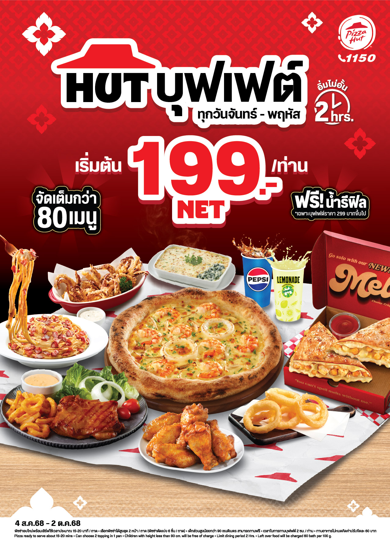 พิซซ่า ฮัท 1150 ภายใต้การบริหารของบริษัท พีเอช แคปปิตอล จำกัด กลับมาเอาใจสายบุฟเฟต์อีกครั้ง! กับ “HUT บุฟเฟต์” โฉมใหม่ ใหญ่กว่าเดิม แซ่บกว่าเคย! เพิ่มความฟินแบบจัดเต็มด้วยเมนูสุดหลากหลายกว่า 80 รายการ มาที่เดียวอิ่มครบ ทั้งพิซซ่า สปาเก็ตตี้ อาหารทานเล่น ข้าว เมนูอบชีส สเต๊กพรีเมียม ของหวาน และเครื่องดื่มรีฟีล ไฮไลต์เด็ดของครั้งนี้ขอท้าให้ทุกคนได้ลิ้มลองกับ เมนู HUT เสน่ห์ไทย ทั้งพิซซ่าและเมนูไรซ์โบวล์