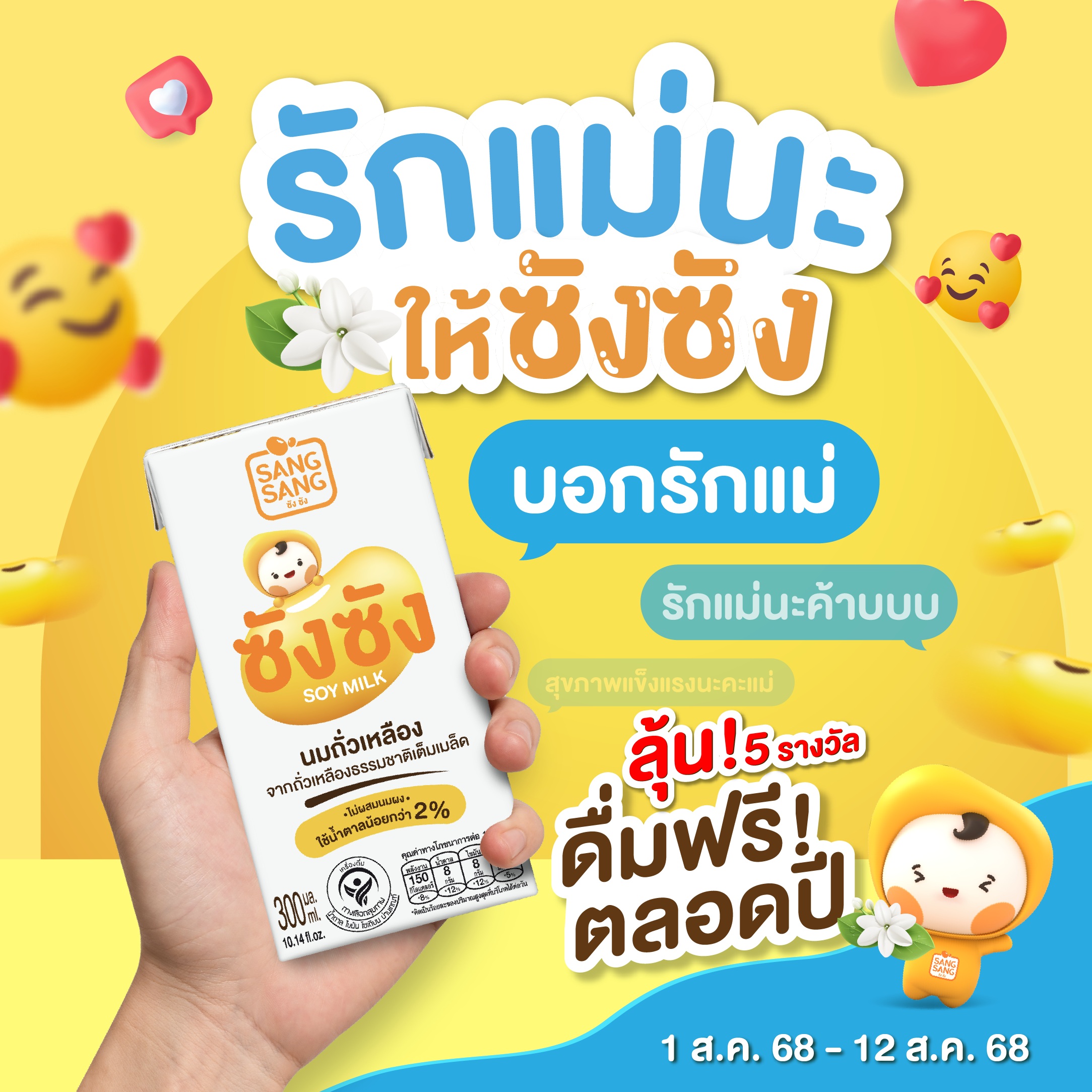 “ซังซัง” นมถั่วเหลืองหอมมันแบบคั้นสด ผลิตจากเมล็ดถั่วเหลืองคุณภาพสูงจากประเทศแคนาดา น้ำตาลน้อยกว่า 2% ชวนทุกคนมาสุขภาพดี ดื่มซังซังได้โปรตีนเน้นๆ พร้อมกิจกรรมบอกรักแม่ ลุ้นรับซังซังให้แม่ดื่มสุขภาพดีทุกวัน เพียงแชร์โพสต์เป็นสาธารณะและคอมเมนต์บอกรักแม่ในแบบของคุณ จากนั้นแคปโพสต์มายืนยัน ลุ้นเป็น 5 ผู้โชคดีรับรางวัลซังซัง 300 มล. จำนวน 10 ลัง ร่วมสนุกกันได้ตั้งแต่วันที่ 1-12 ส.ค. 2568 ประกาศชื่อผู้โชคดี 15 ส.ค. 2568 ทาง FB: SangSang ดูรายละเอียดเพิ่มเติมได้ที่ https://bit.ly/3w0PQ5o